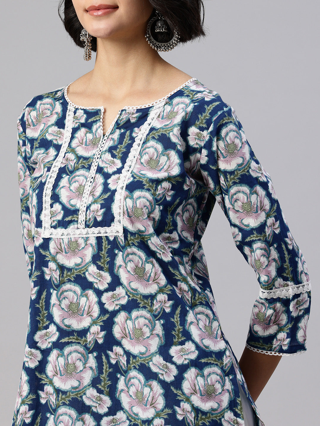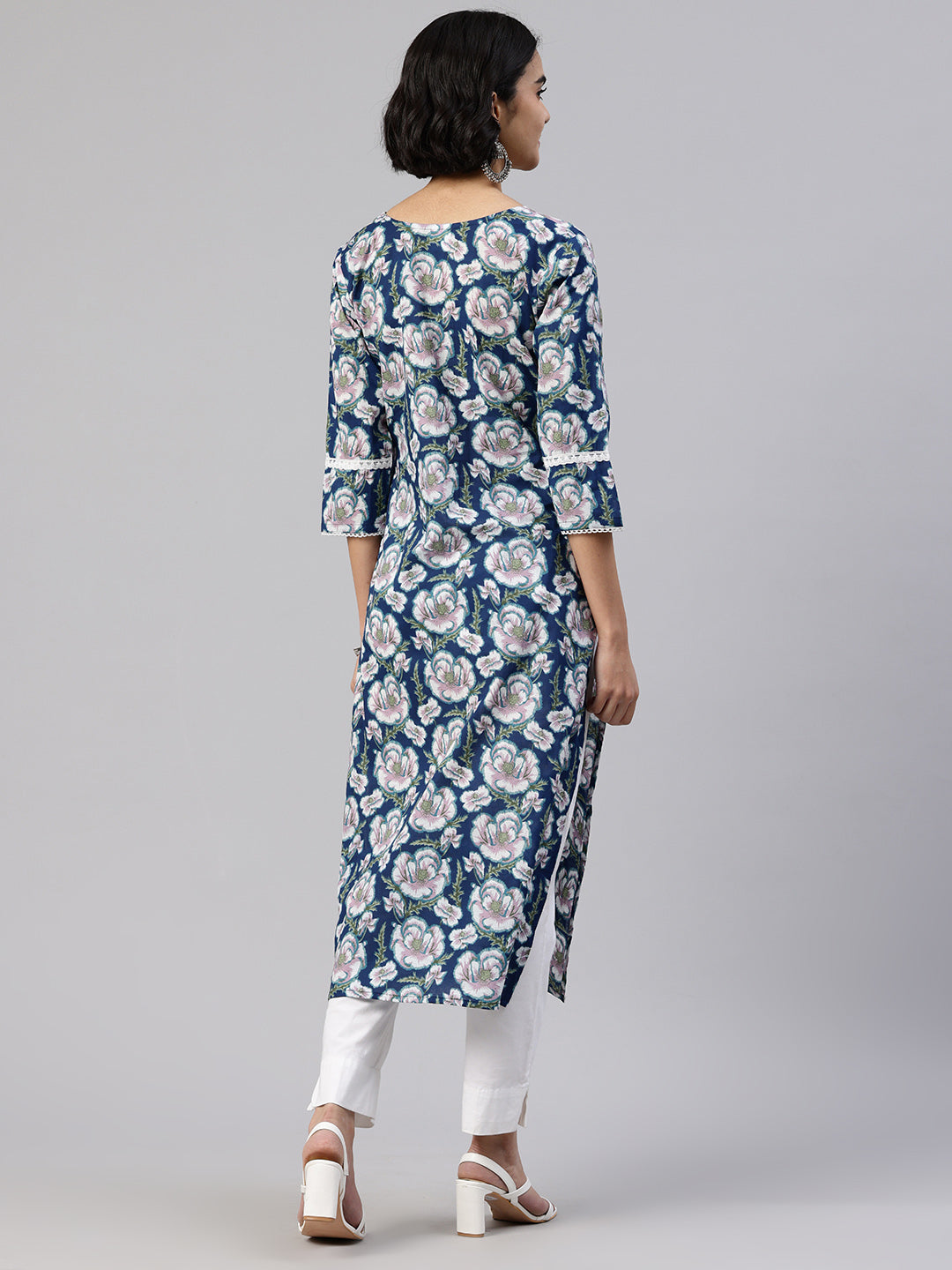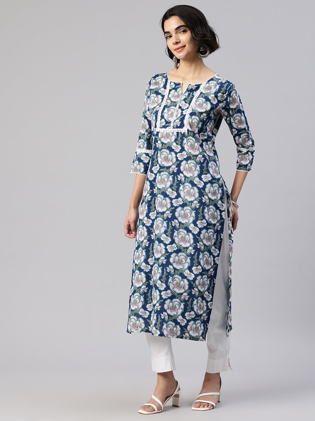 Blue Straight kurta, has a round collar, three-quarter sleeves, straight hem, and multiple slits, Calf Length.