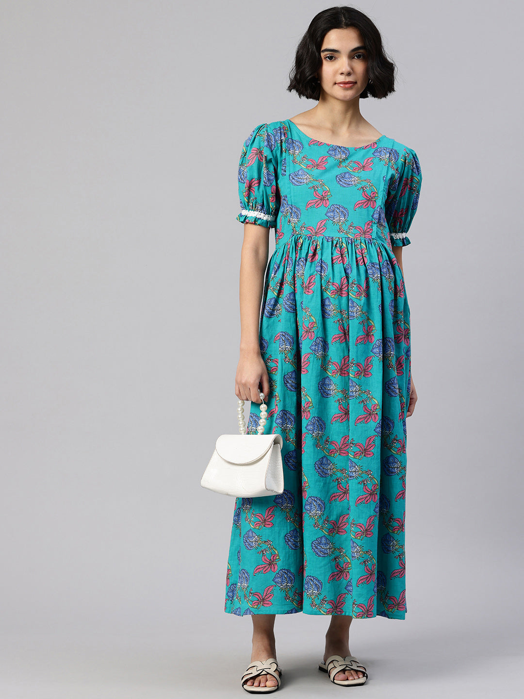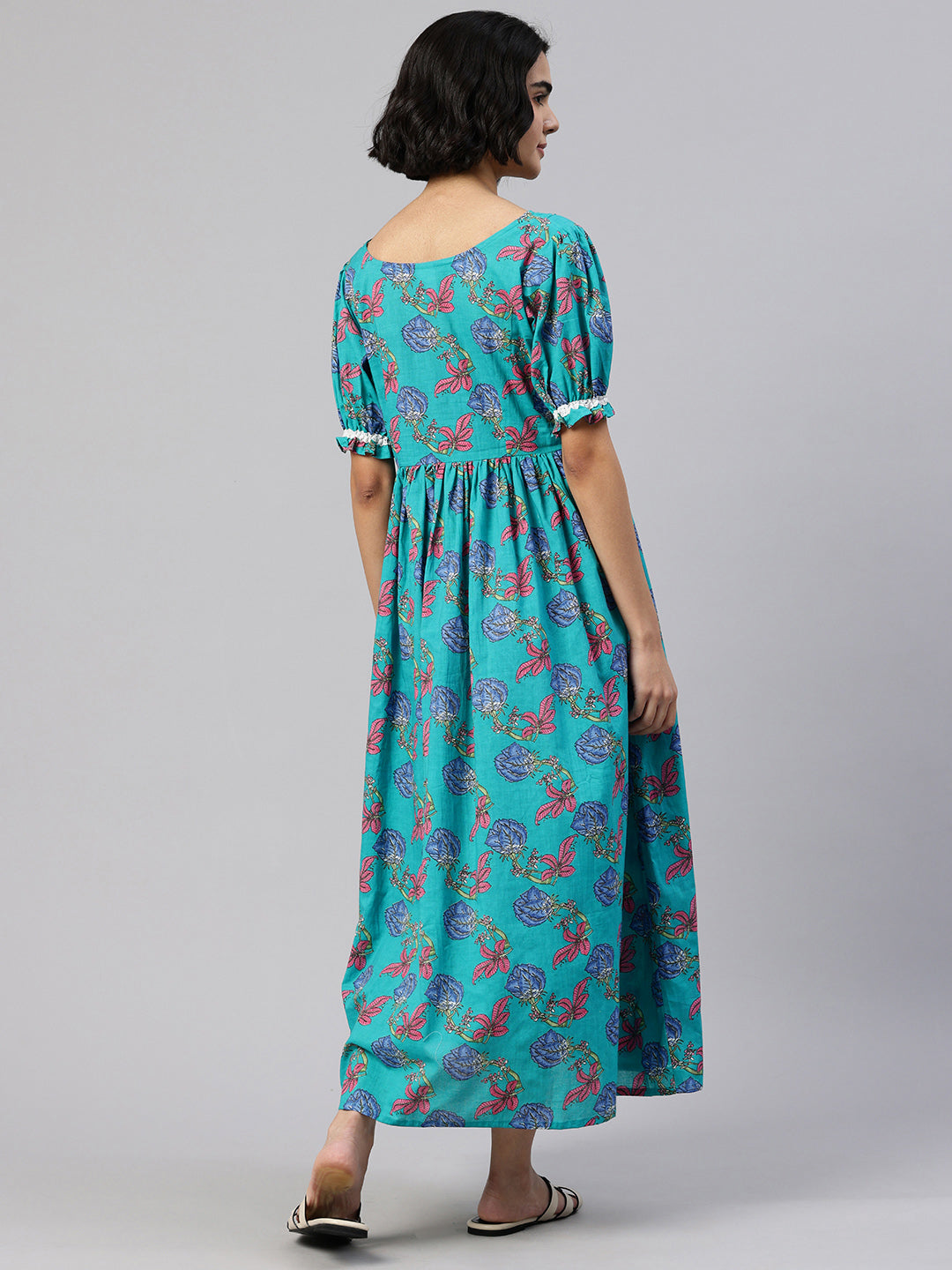 Blue Printed fit and flare dress. Has a Round Collar, short, Puff sleeve, Gathered or pleated detail, Midi length in flared hem.