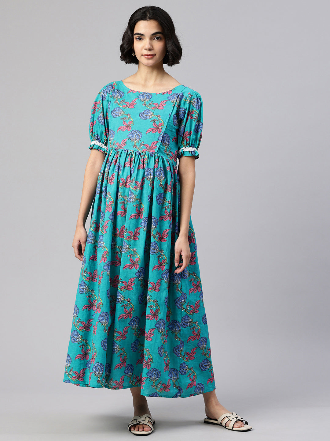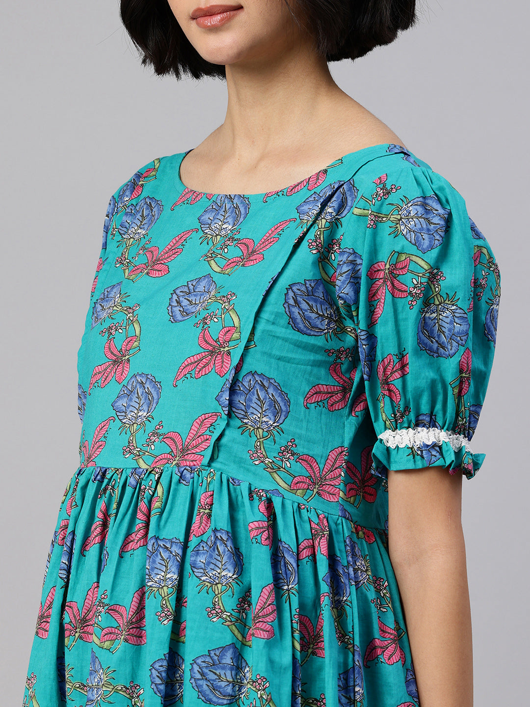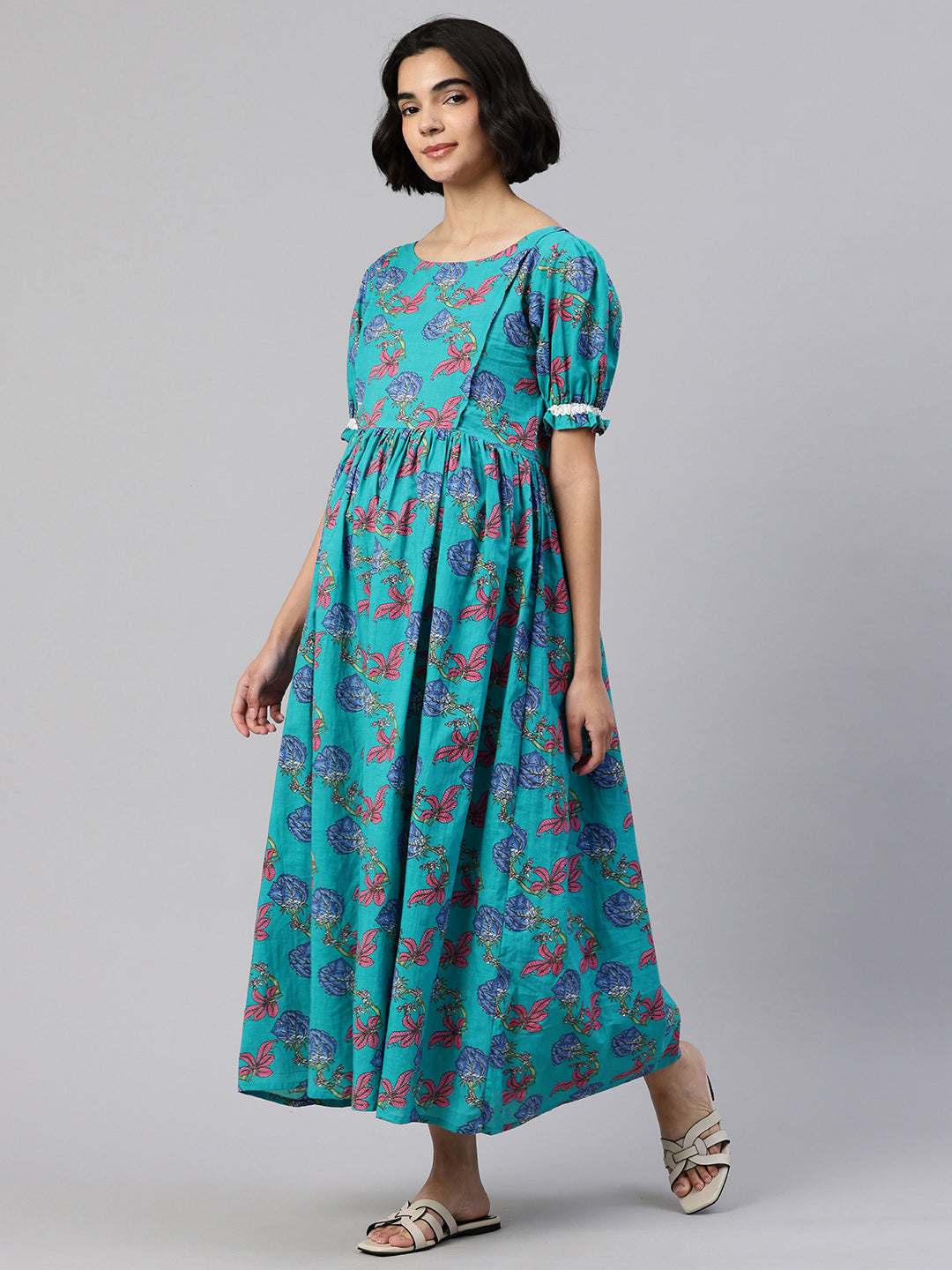 This elegant and comfortable dress is suitable for expecting moms and new moms. Create an absolute style high by going with this Green Floral Print Puff Sleeves Maternity piece in combination with a killer shoe and trendy bangles for a perfect brunch look.