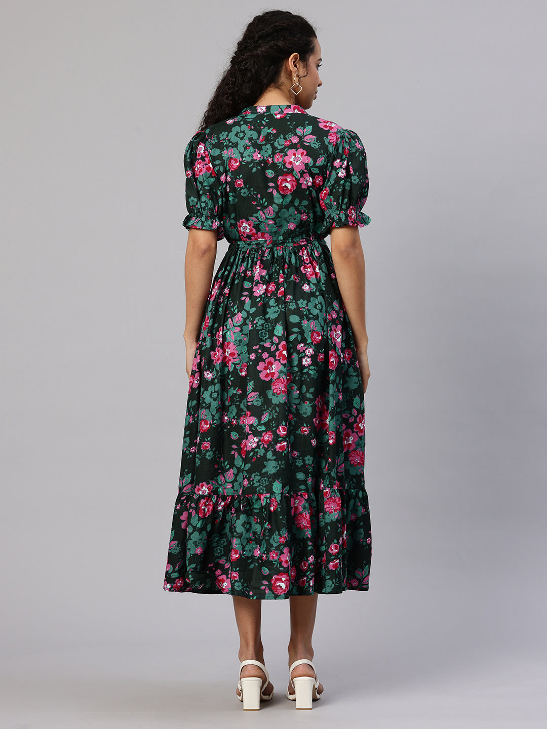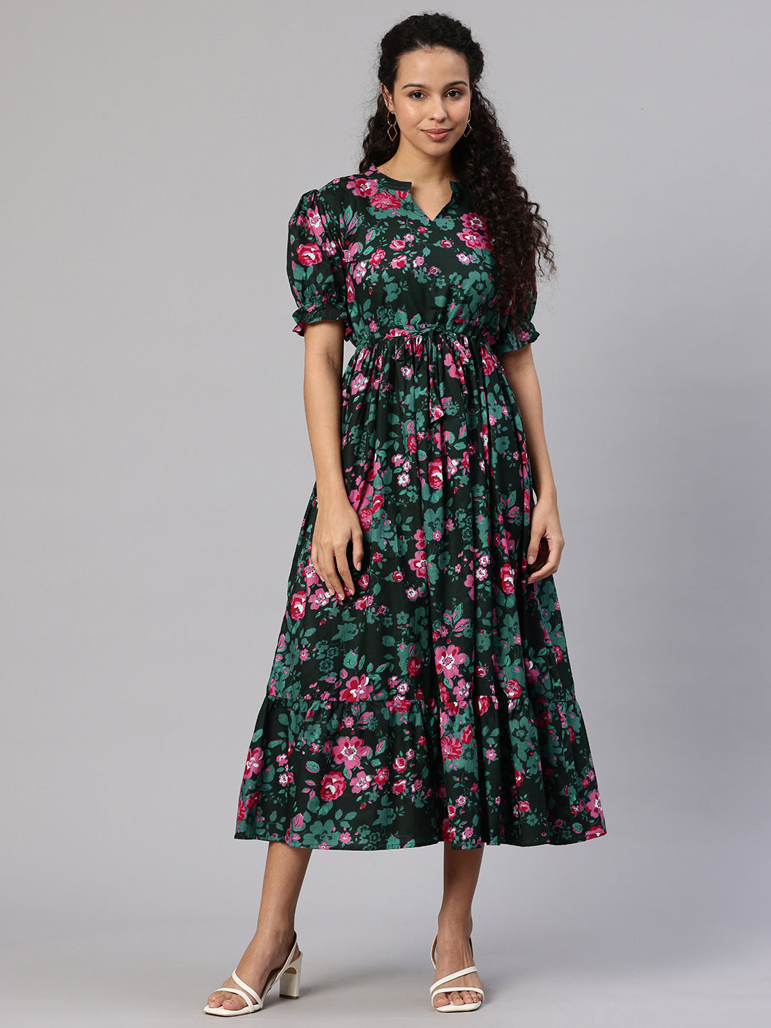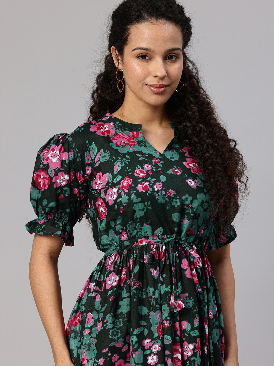 Dark Green Printed fit and flare dress. Has a Mandarin Collar, short, short sleeve, Gathered or pleated detail, Midi length in flared hem.