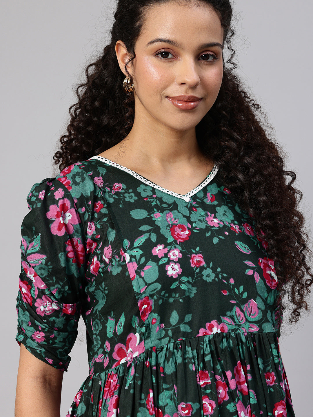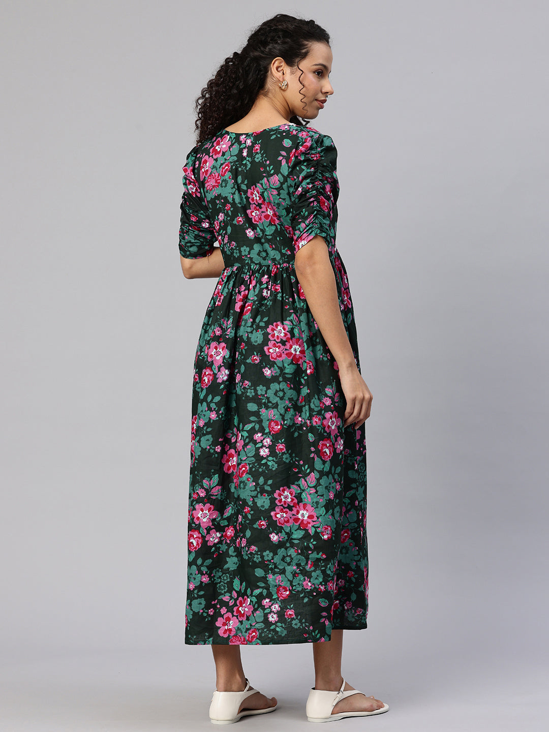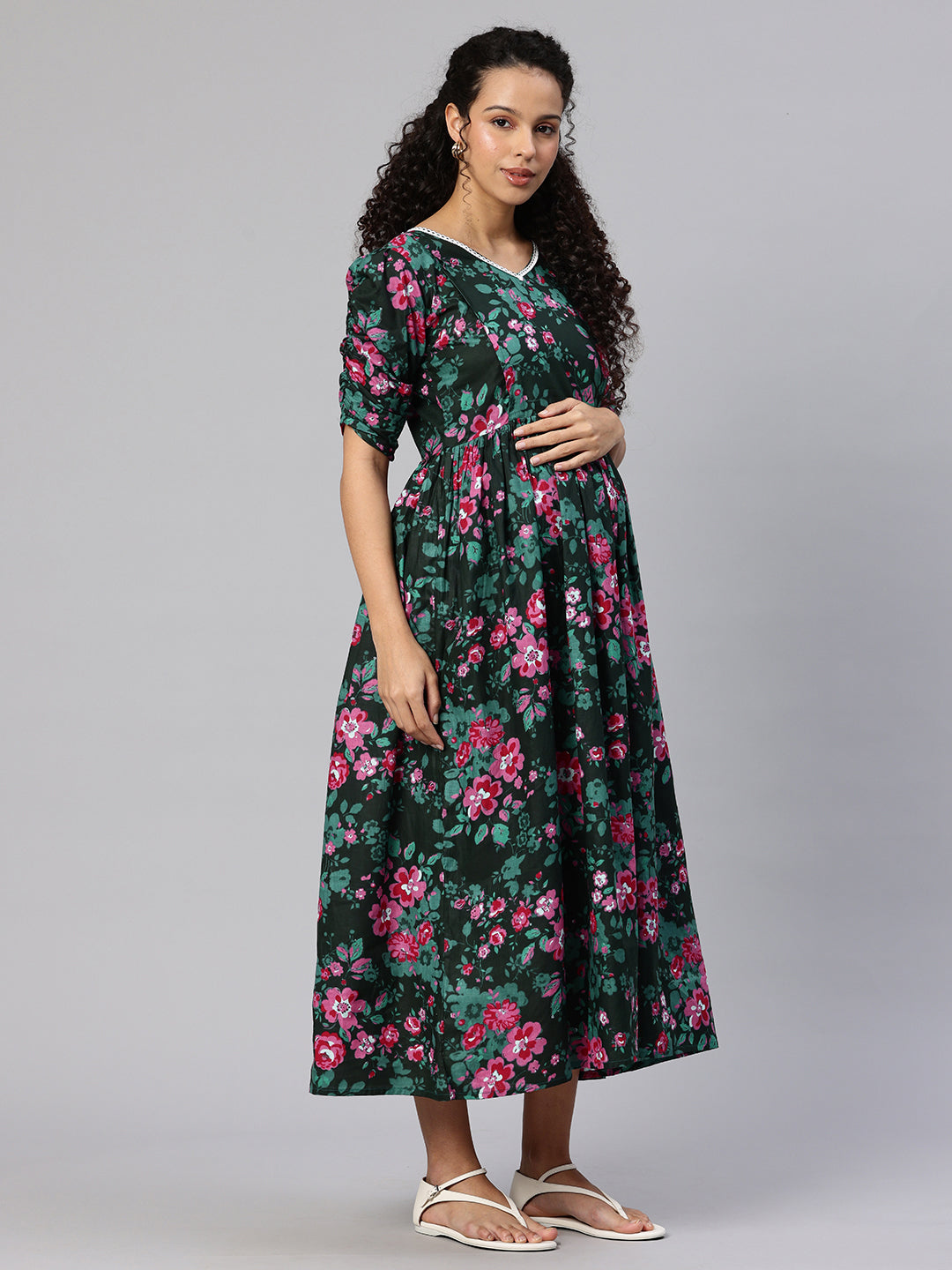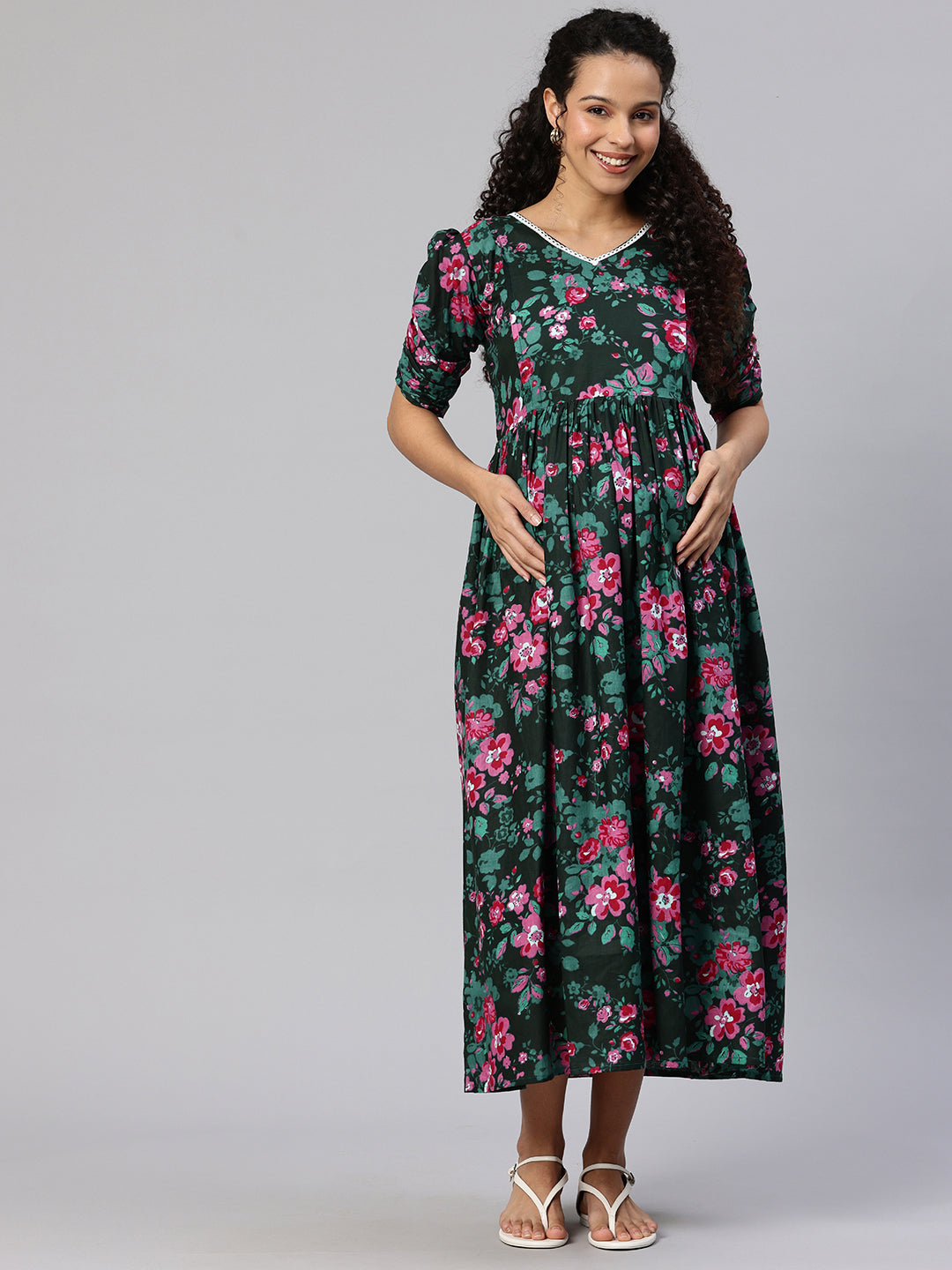 Dark Green Floral Printed A-Line Maternity Midi Dress, has V neck, Short, regular sleeve, Gathered or pleated detail, Midi length in flared hem. The dress has concealed zip closure.