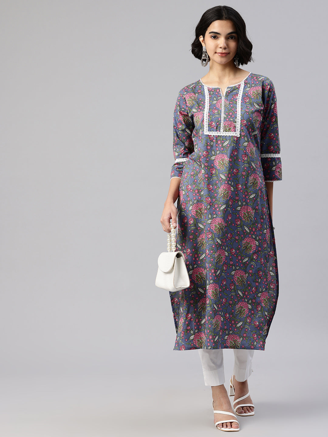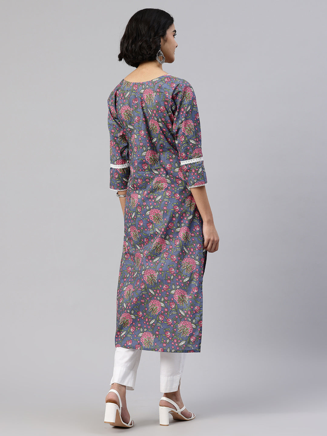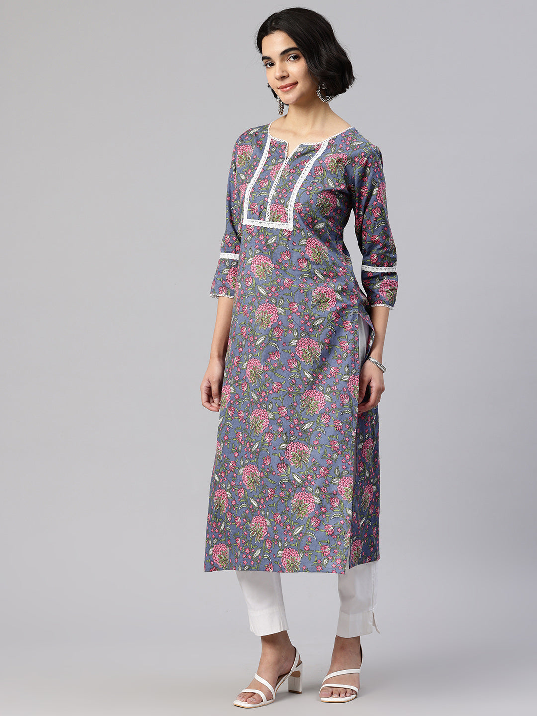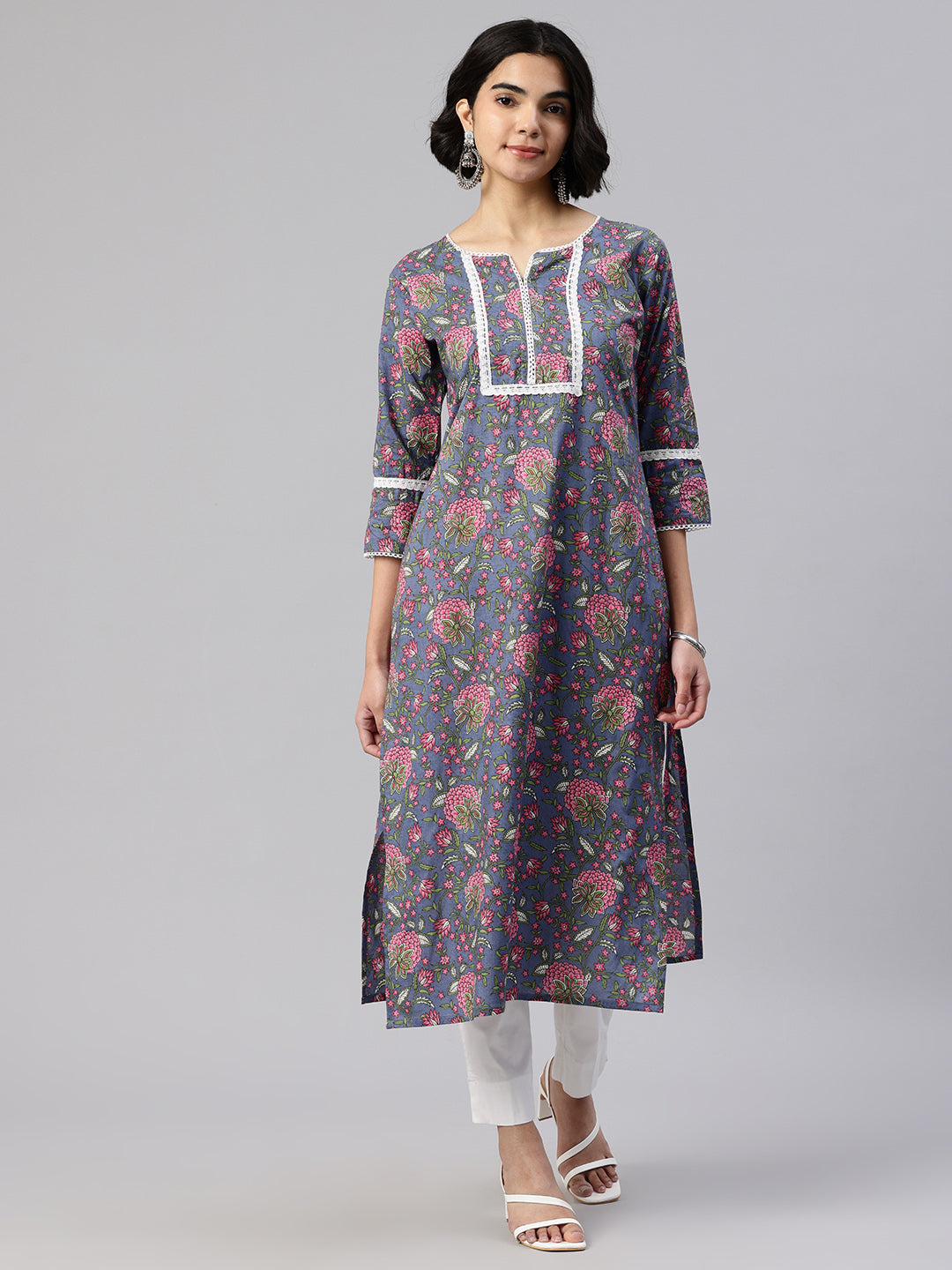 Blue Straight kurta, has a round collar, three-quarter sleeves, straight hem, and multiple slits, Calf Length.