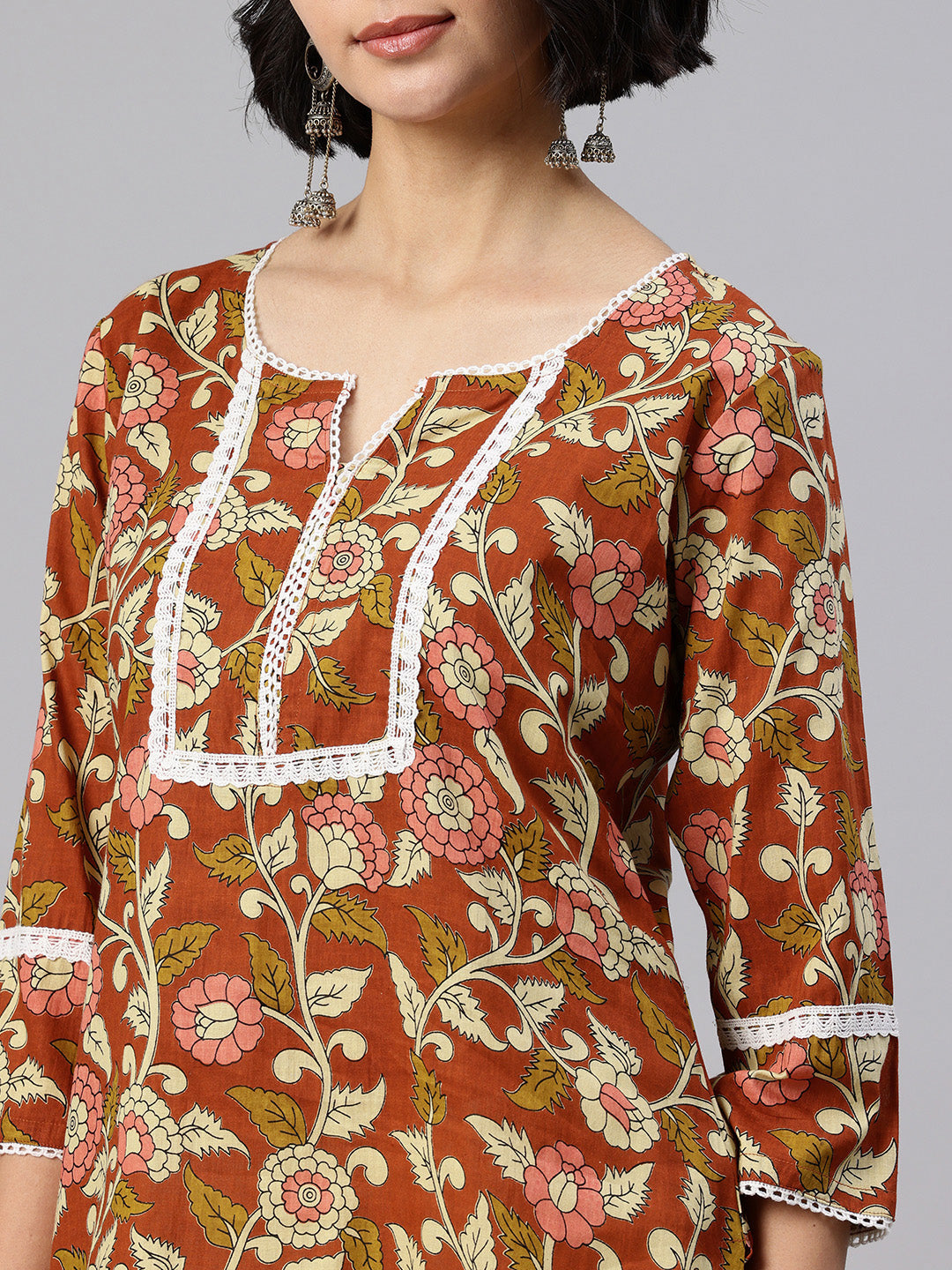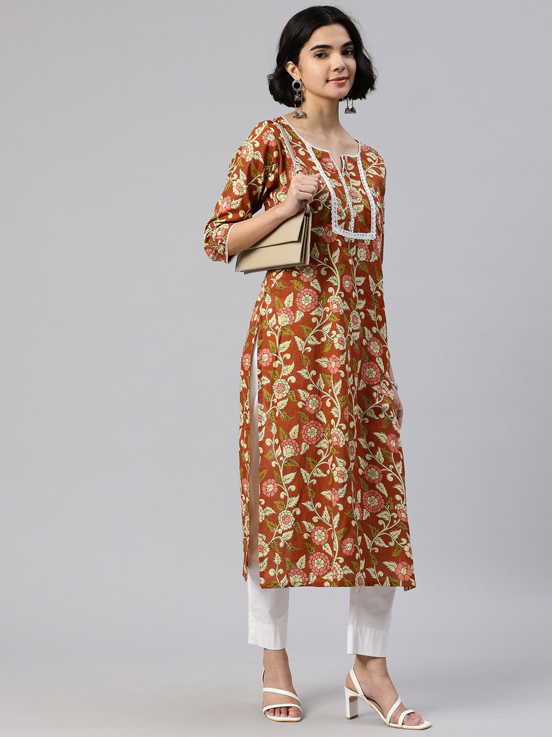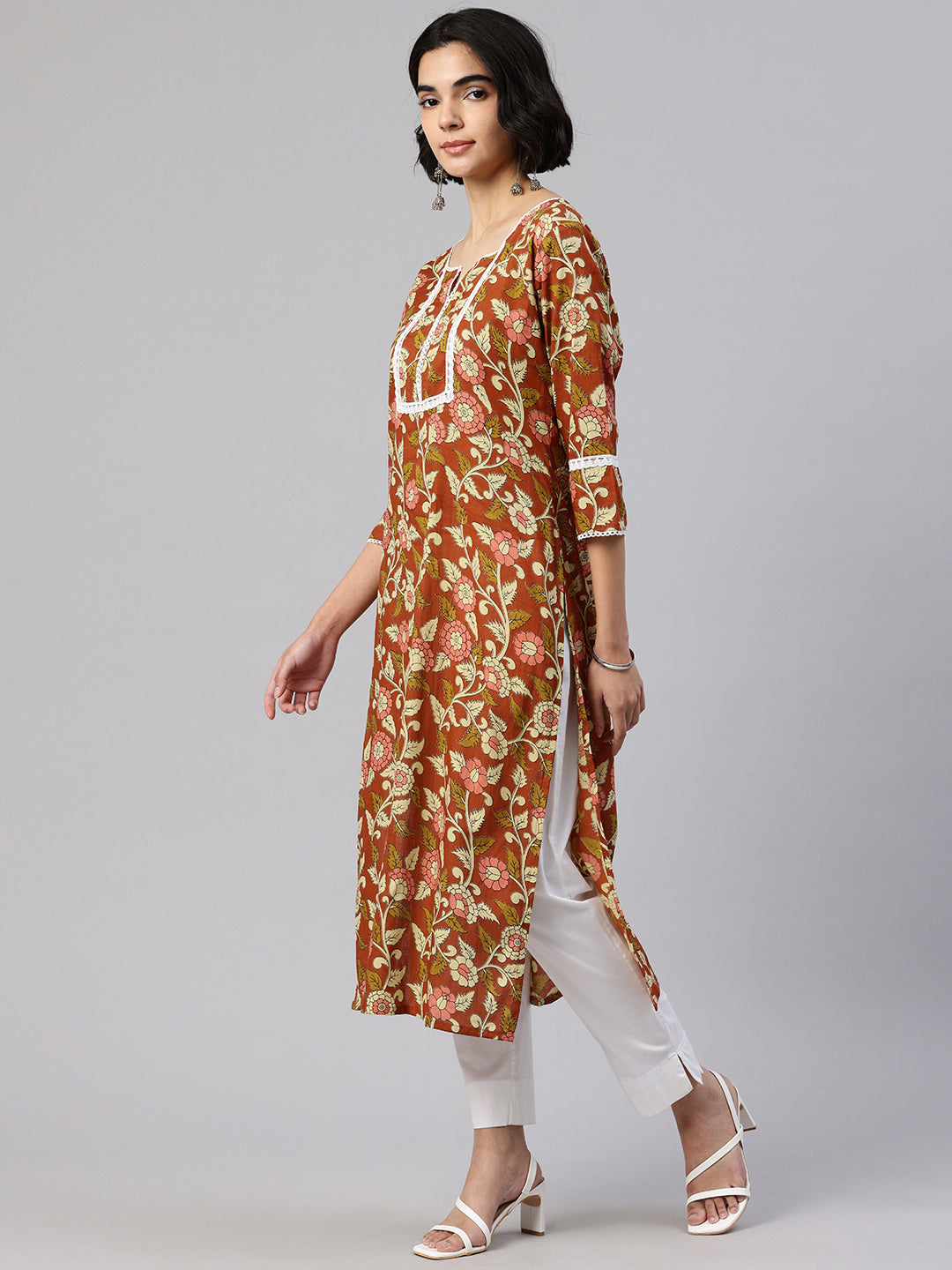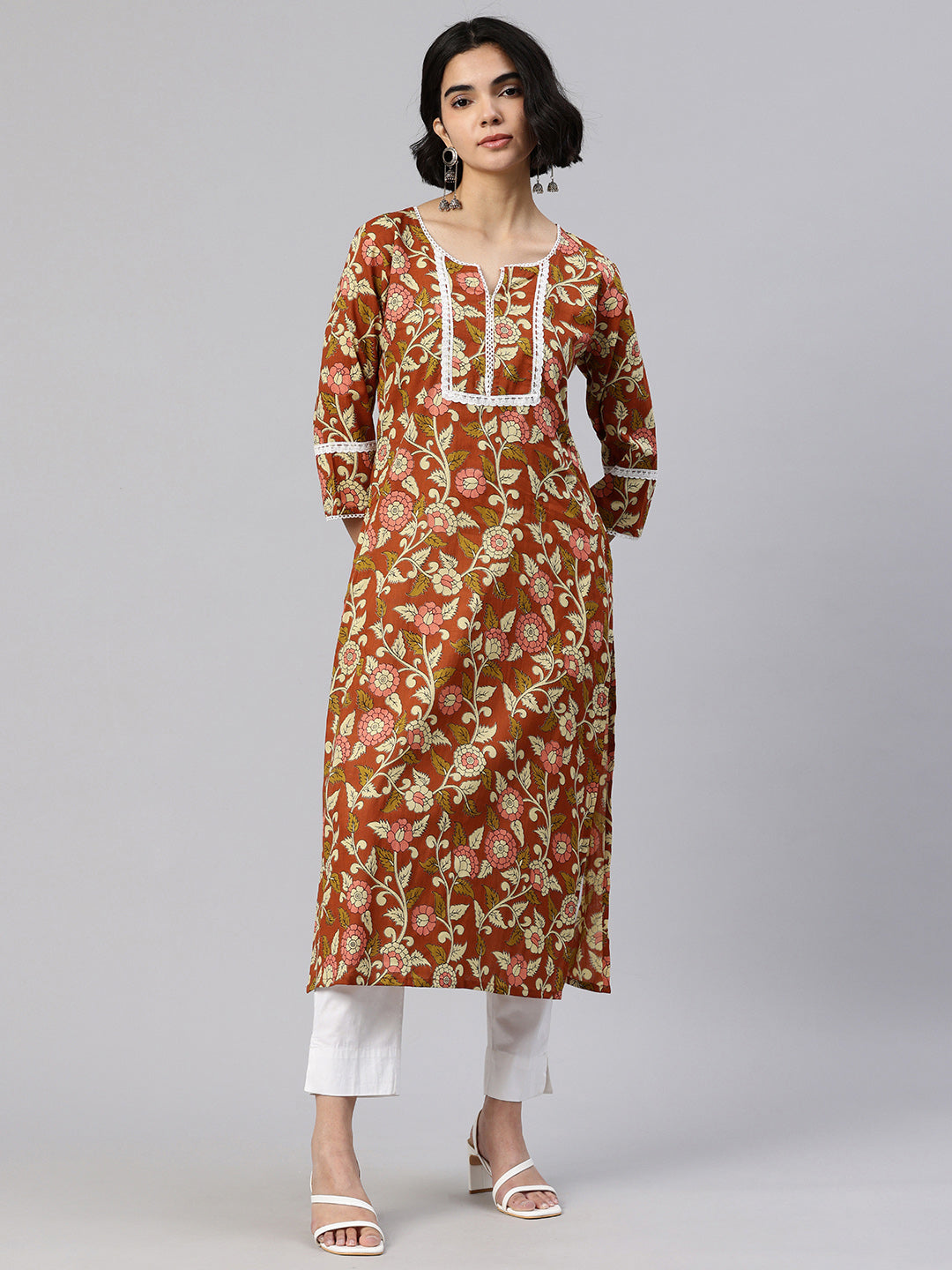 Blue Straight kurta, has a round collar, three-quarter sleeves, straight hem, and multiple slits, Calf Length.