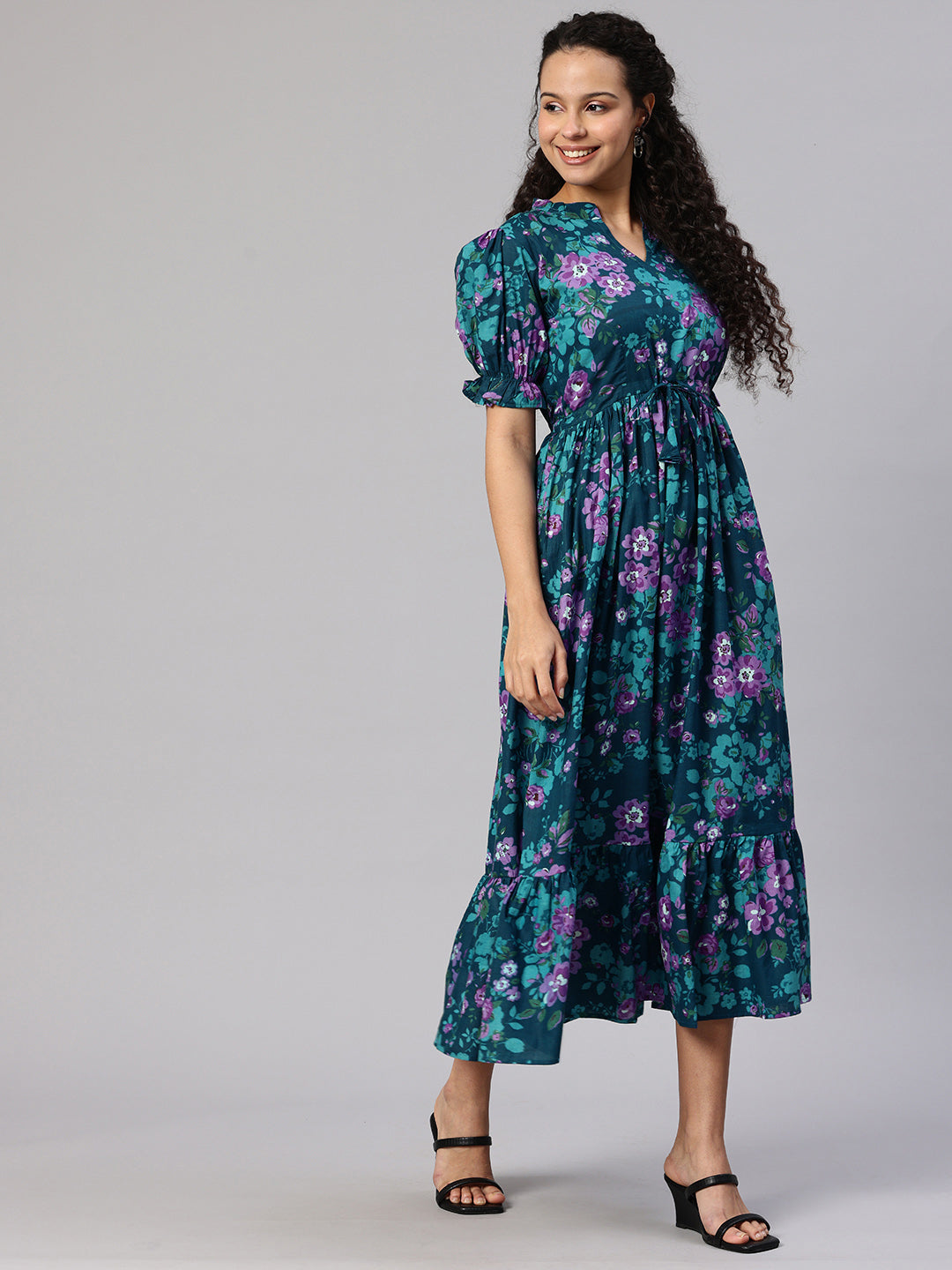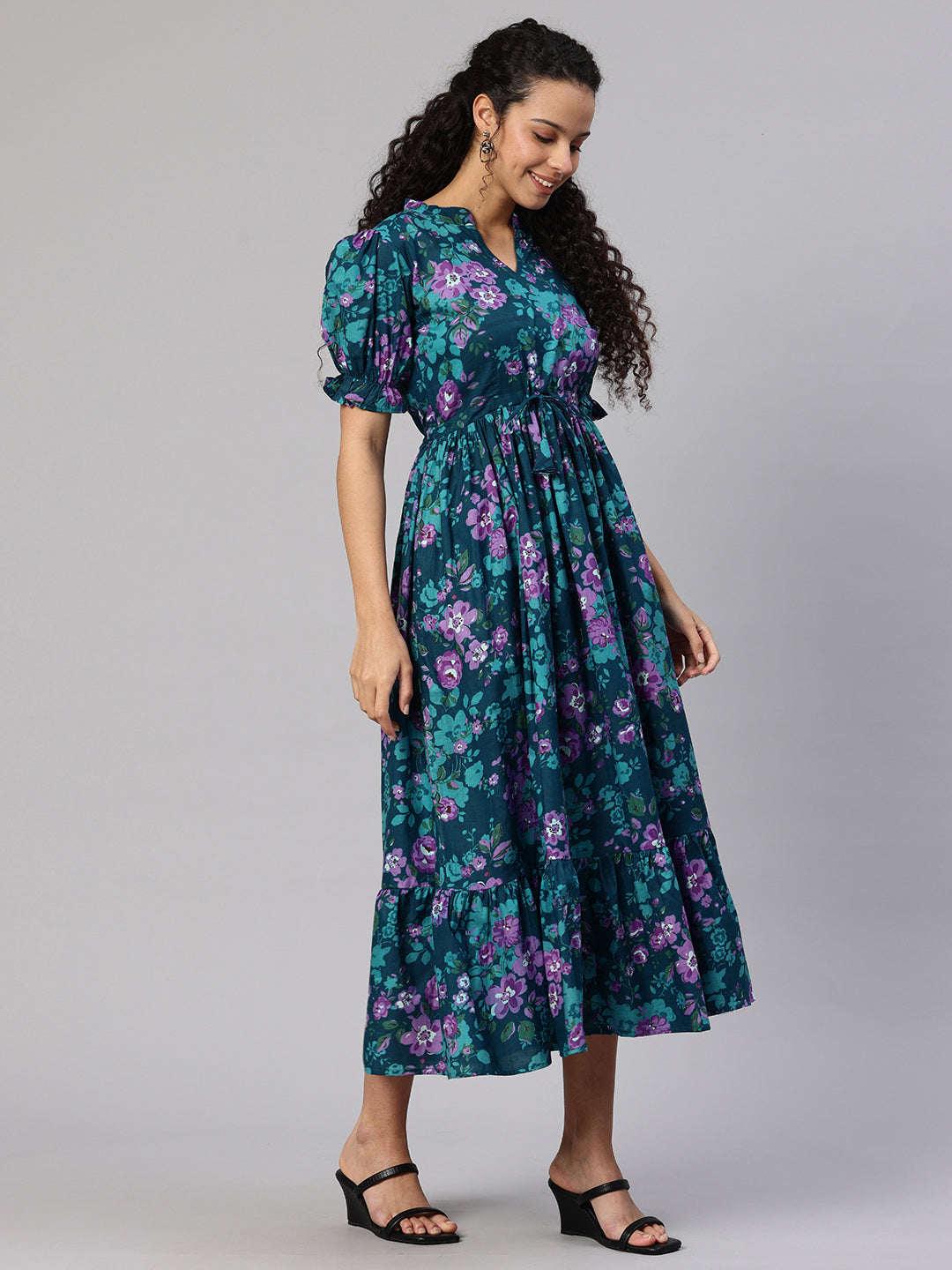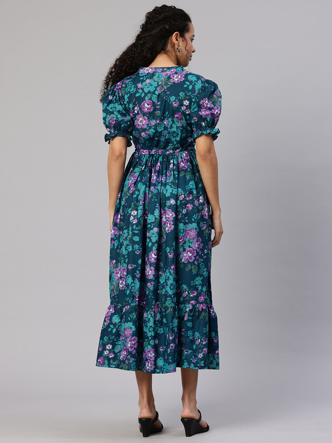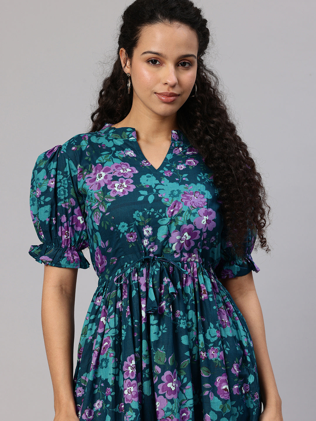 Teal Printed fit and flare dress. Has a Mandarin Collar, short, short sleeve, Gathered or pleated detail, Midi length in flared hem.