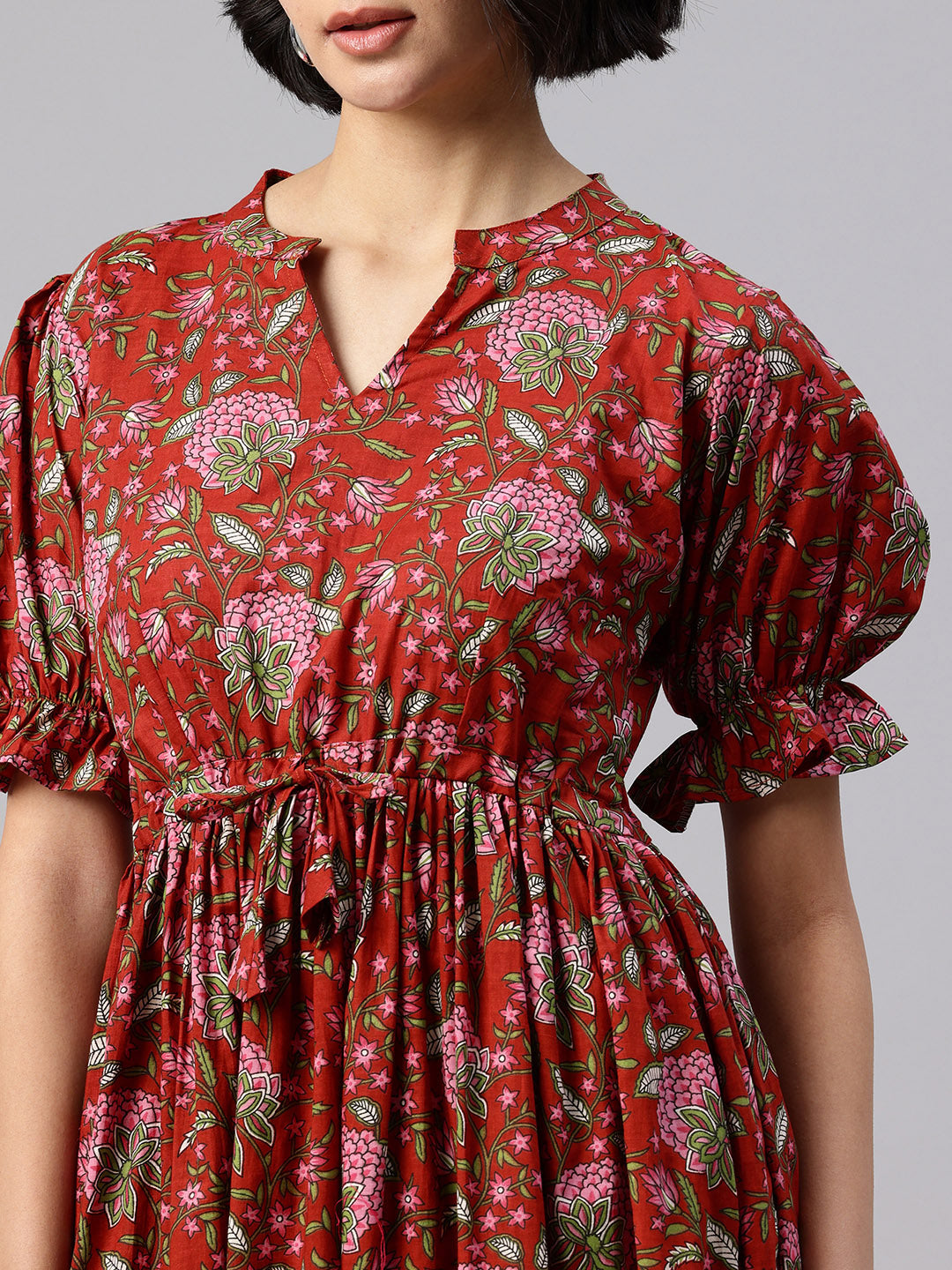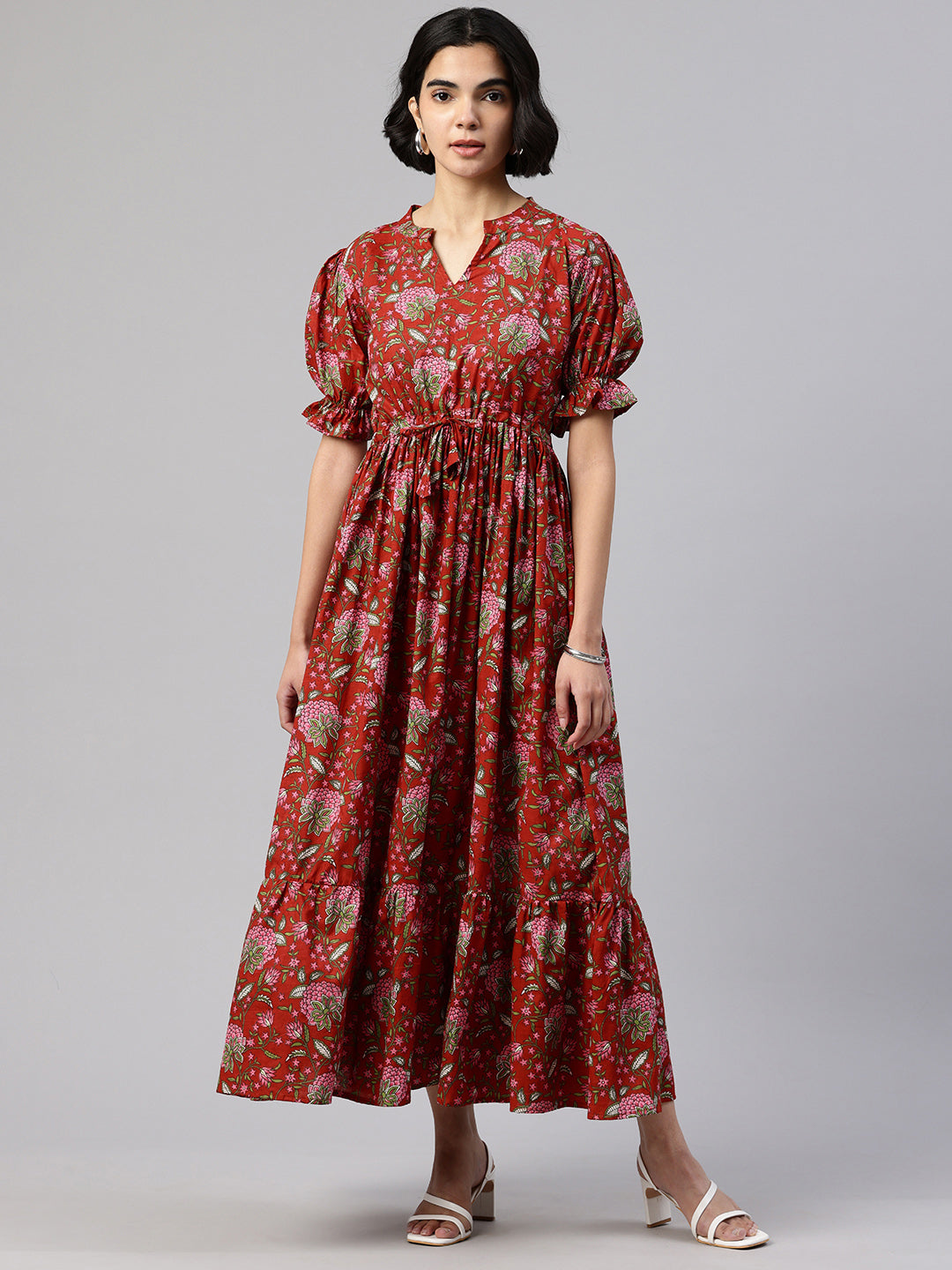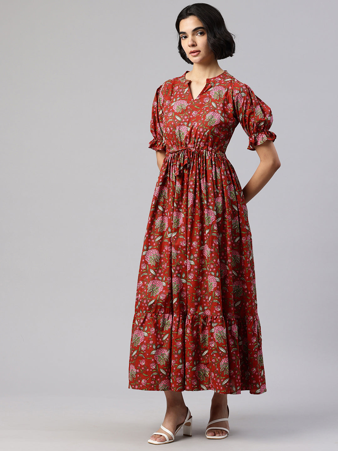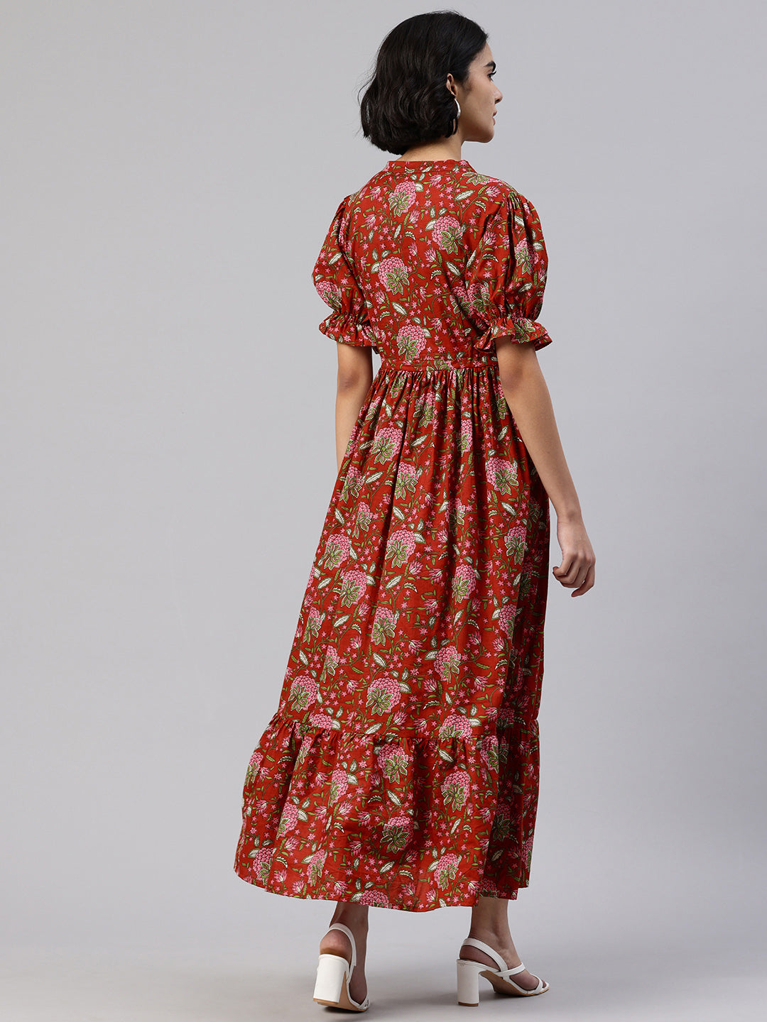 Red Mandarin Collar neck midi dress Puff sleeves and flared hem.