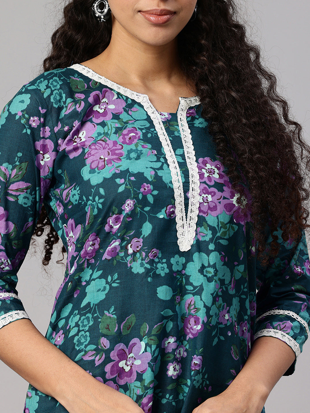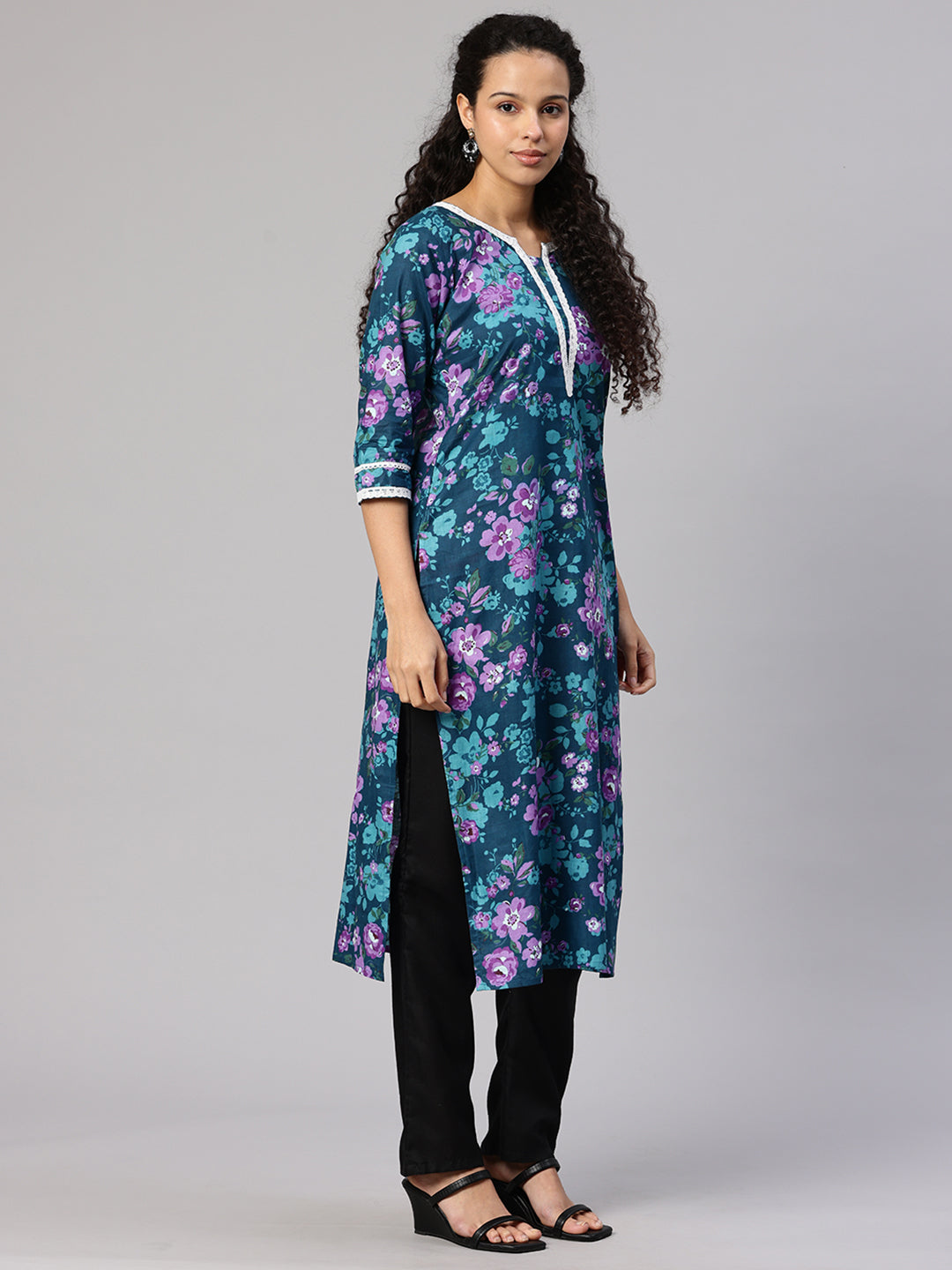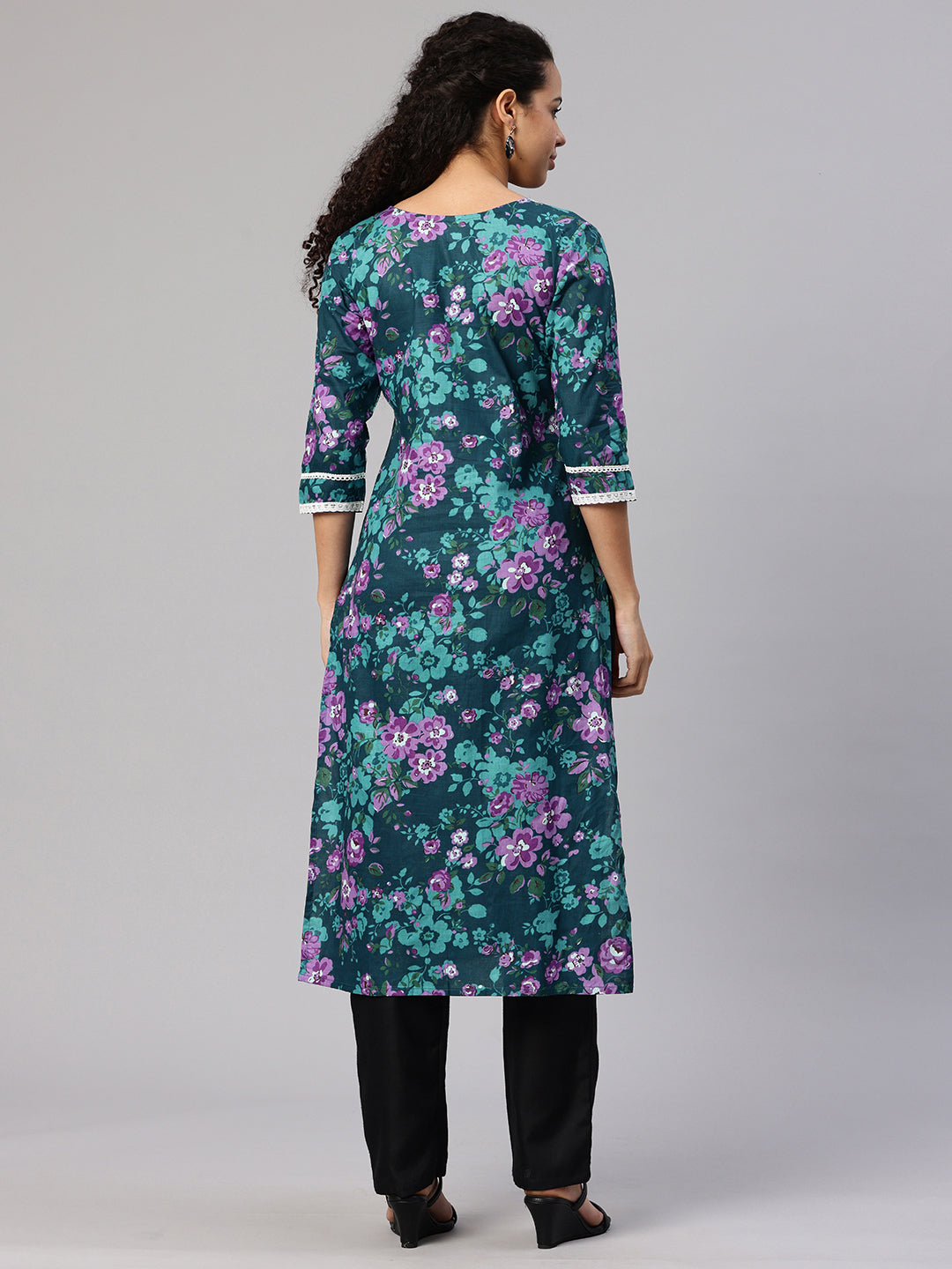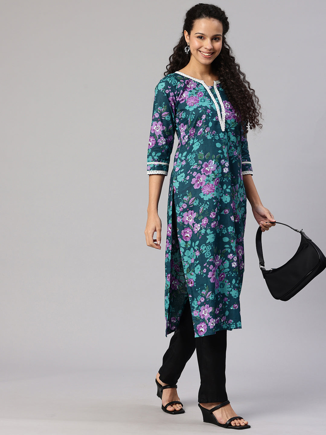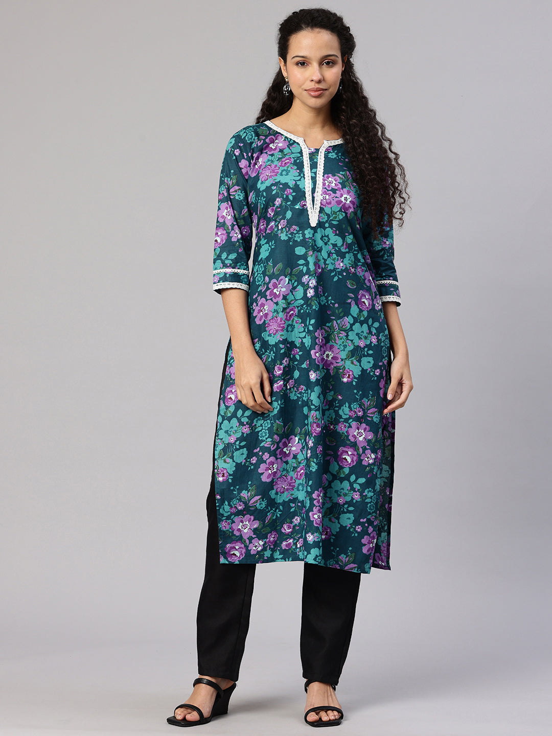 Teal A-line Kurta, has three-quarter regular sleeves, Round Neck, and Straight hem. and Calf Length.
