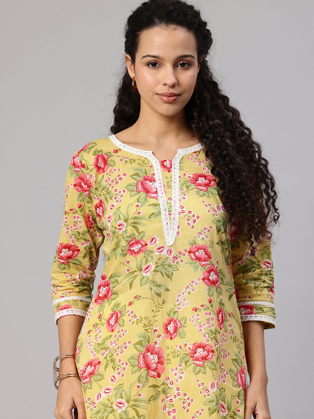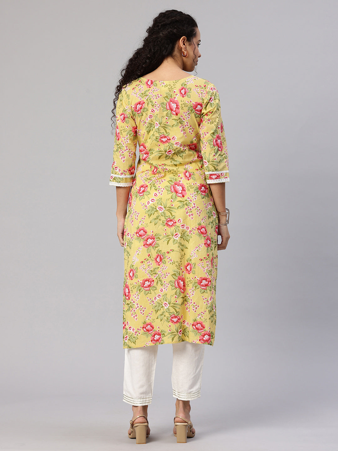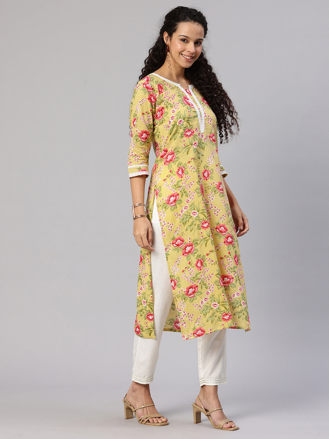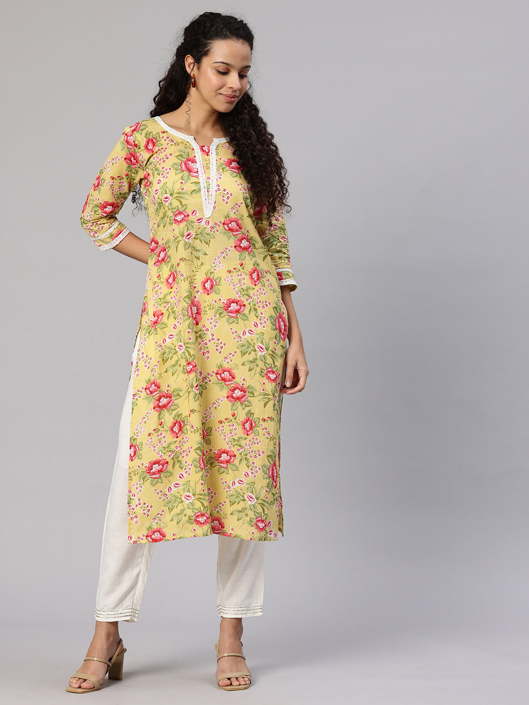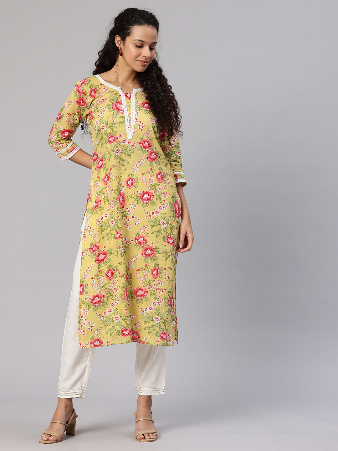 Yellow A-line Kurta, has three-quarter regular sleeves, Round Neck, and Straight hem. and Calf Length.