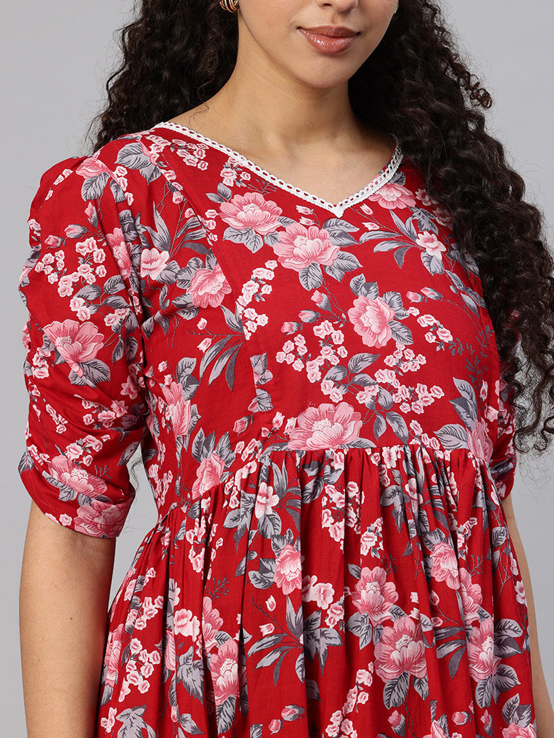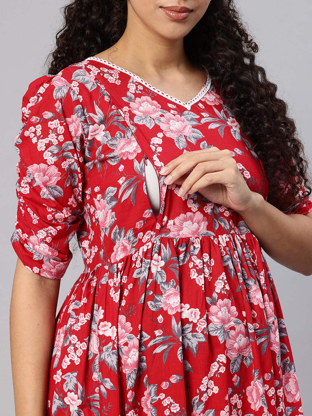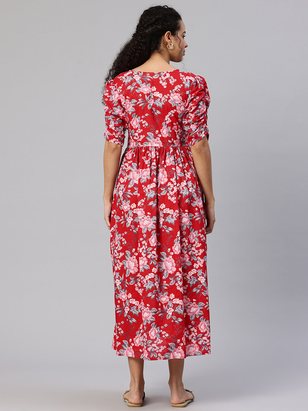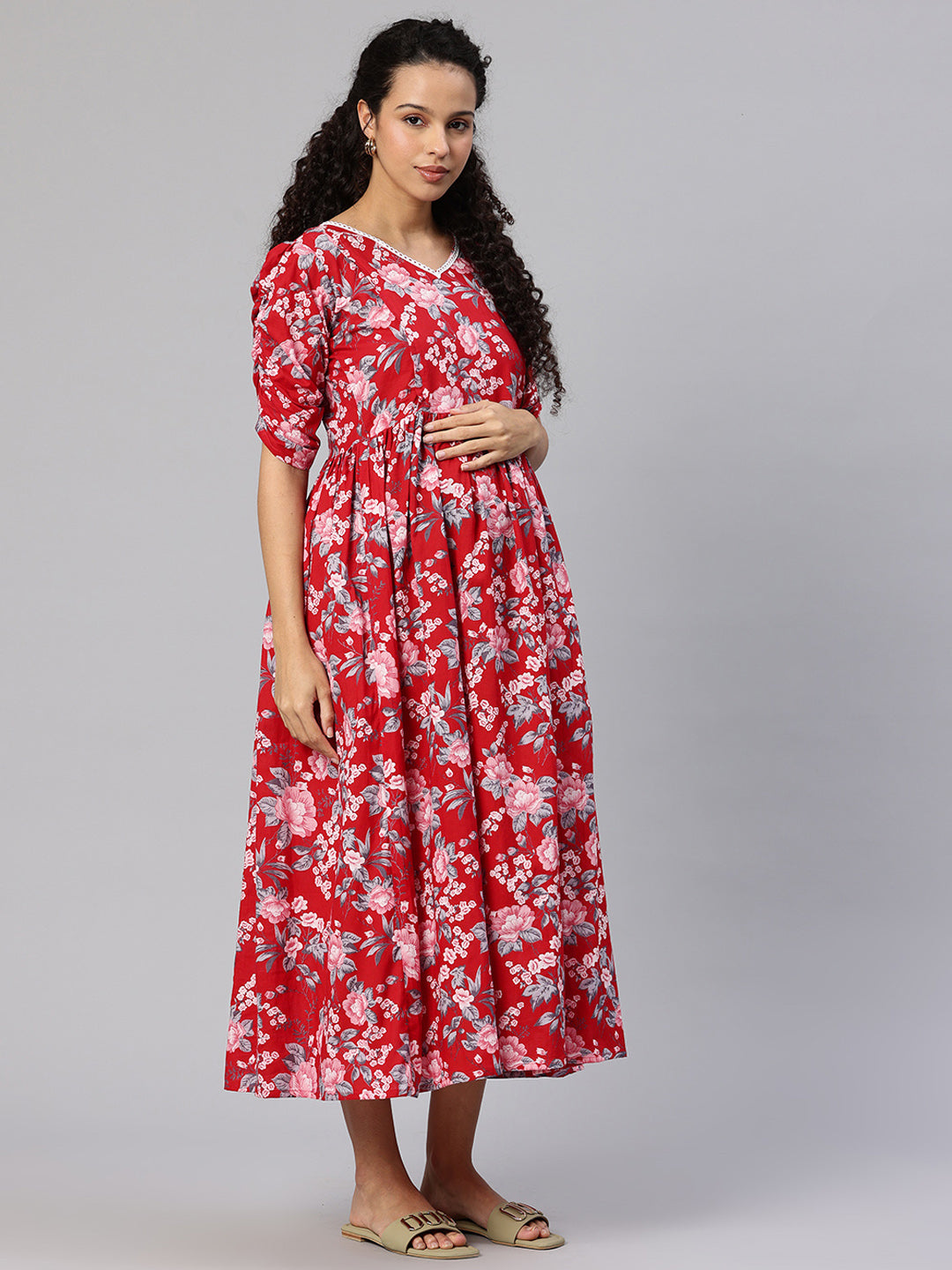 Red Floral print Maternity Dress with Gathered or pleated detail has a V neck, Short sleeves, with pleated detail, zip detail in front and Midi length in flared hem.