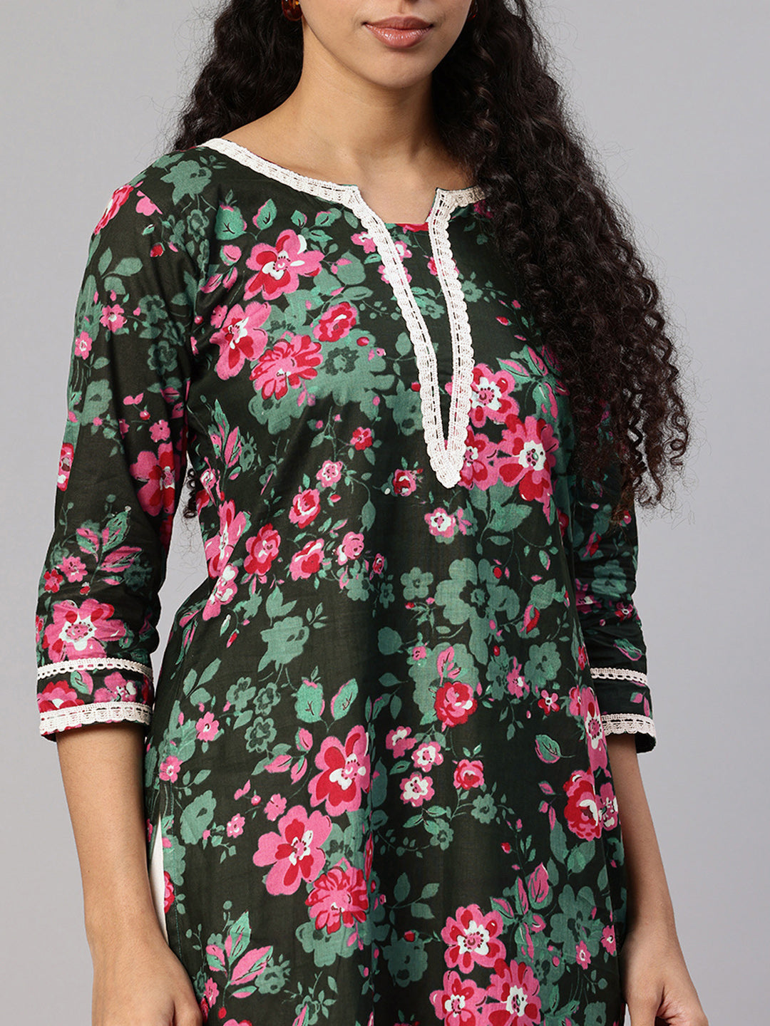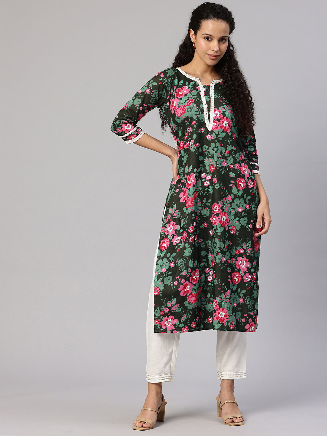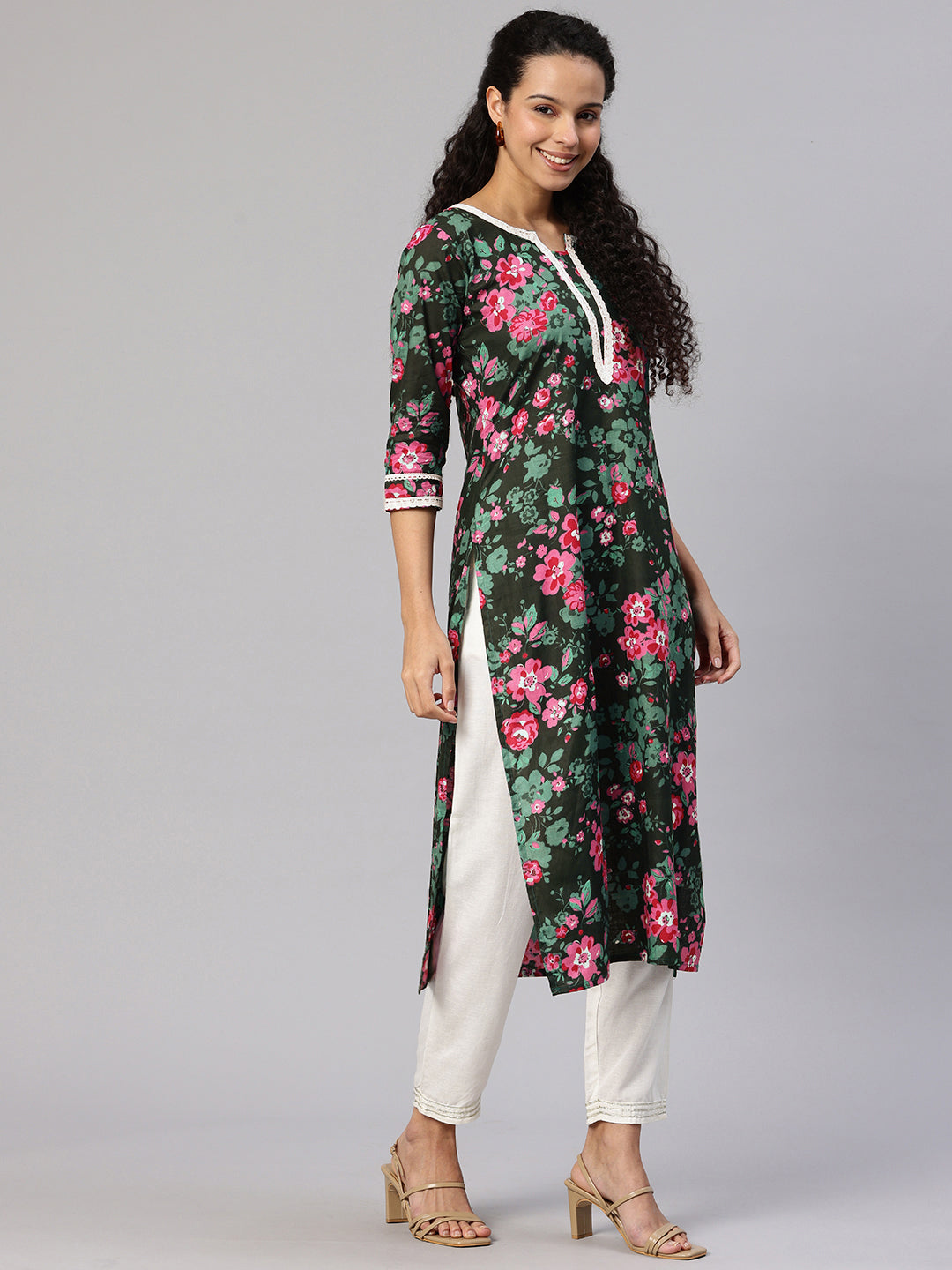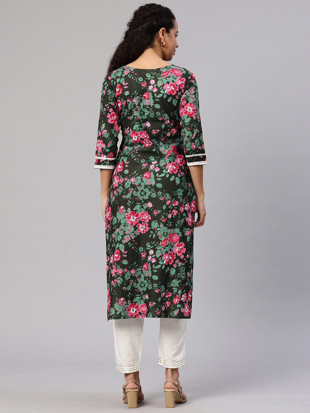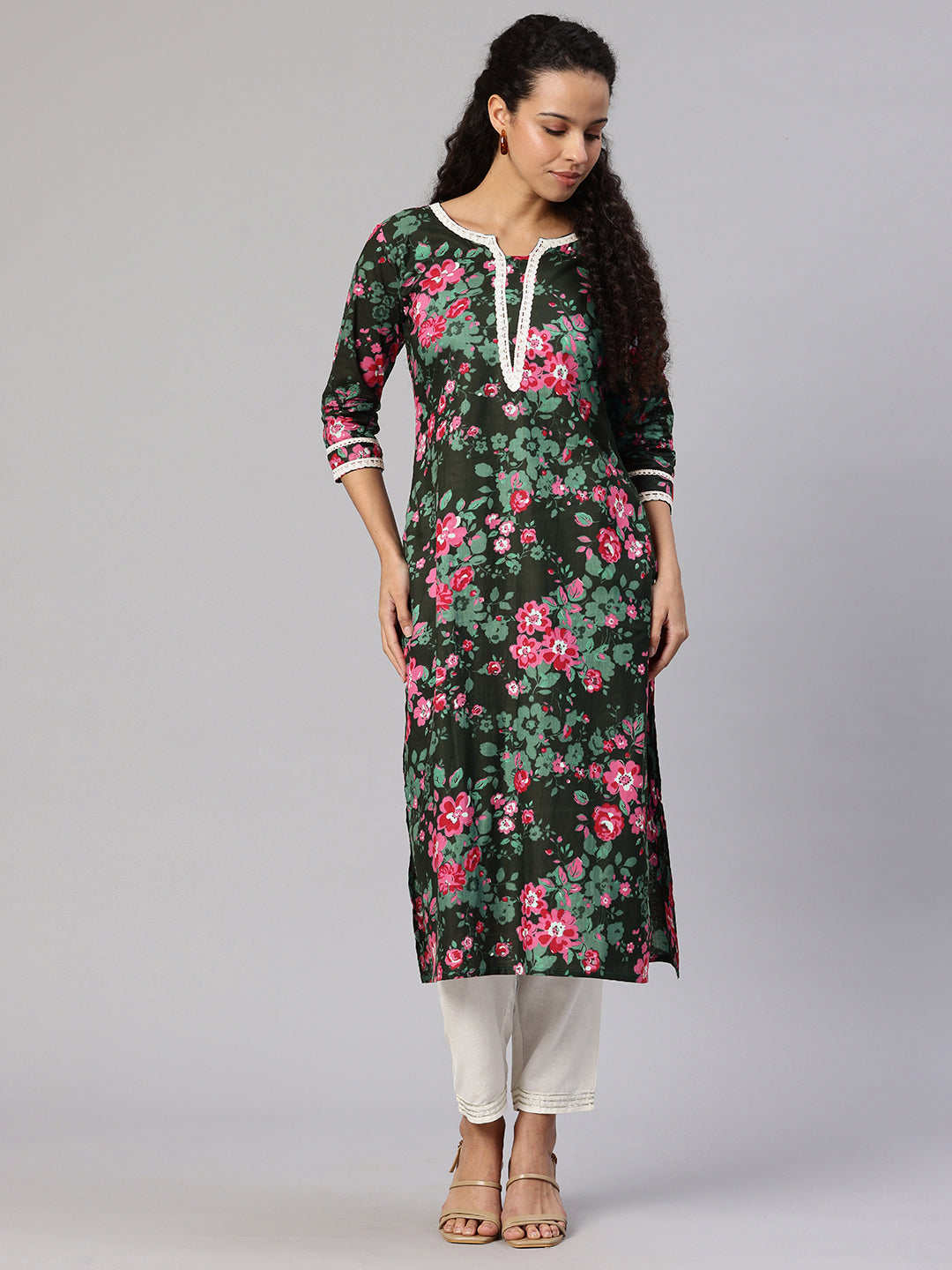 Dark Green A-line Kurta, has three-quarter regular sleeves, Round Neck, and Straight hem. and Calf Length.