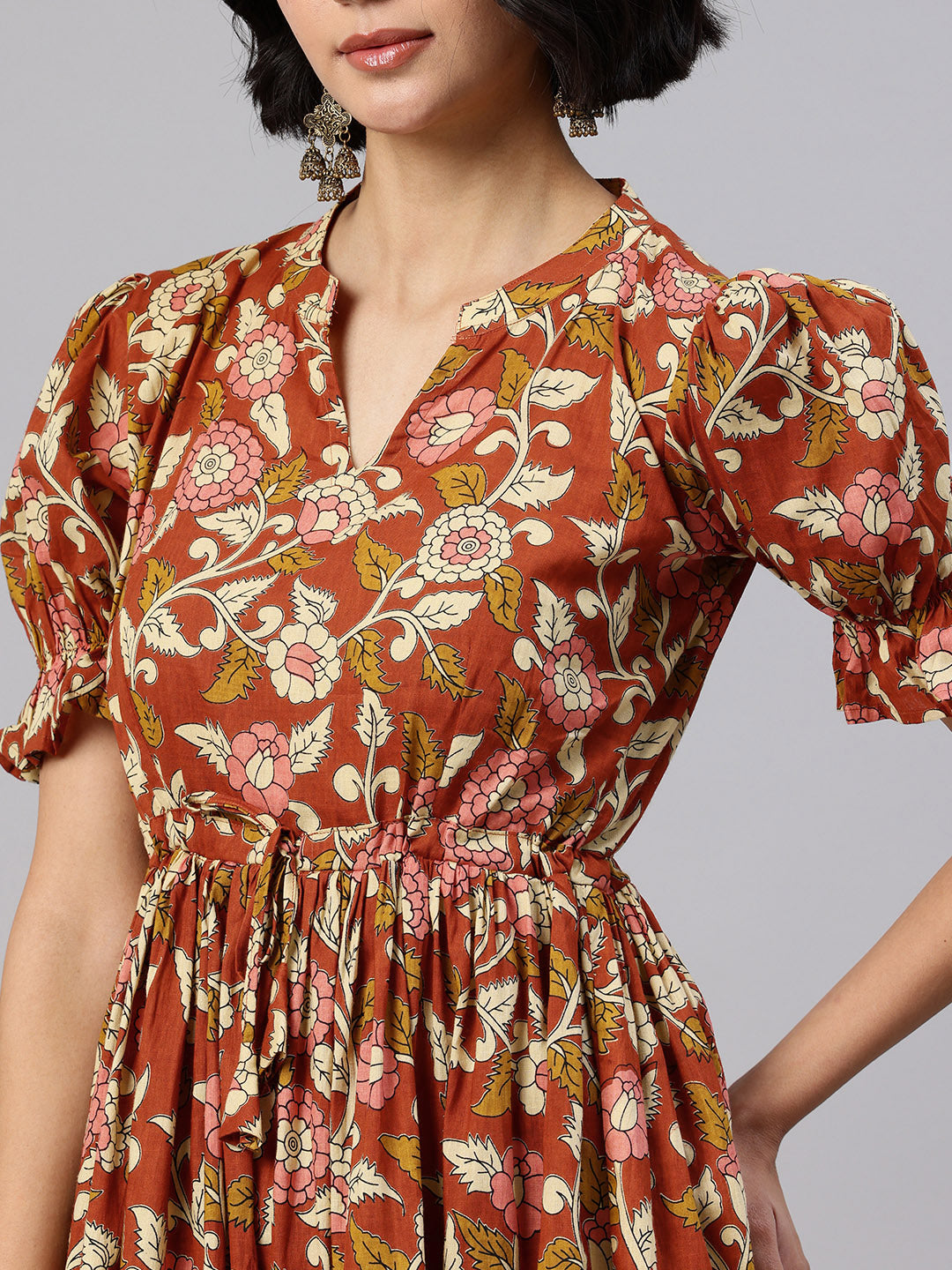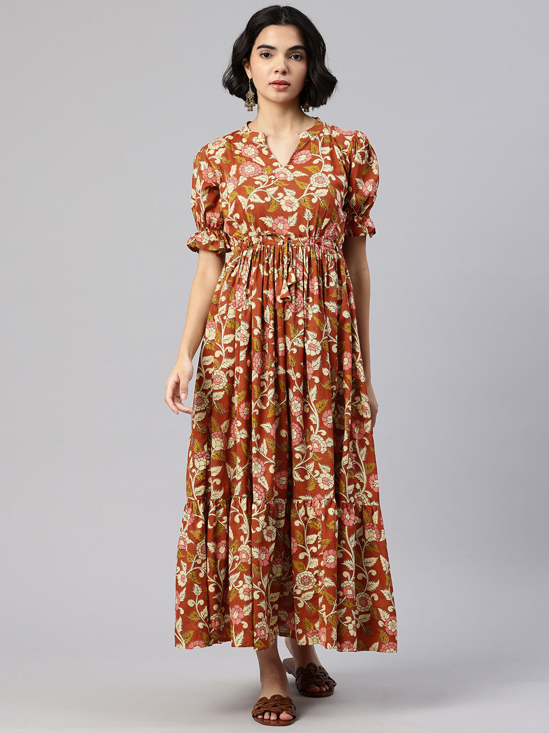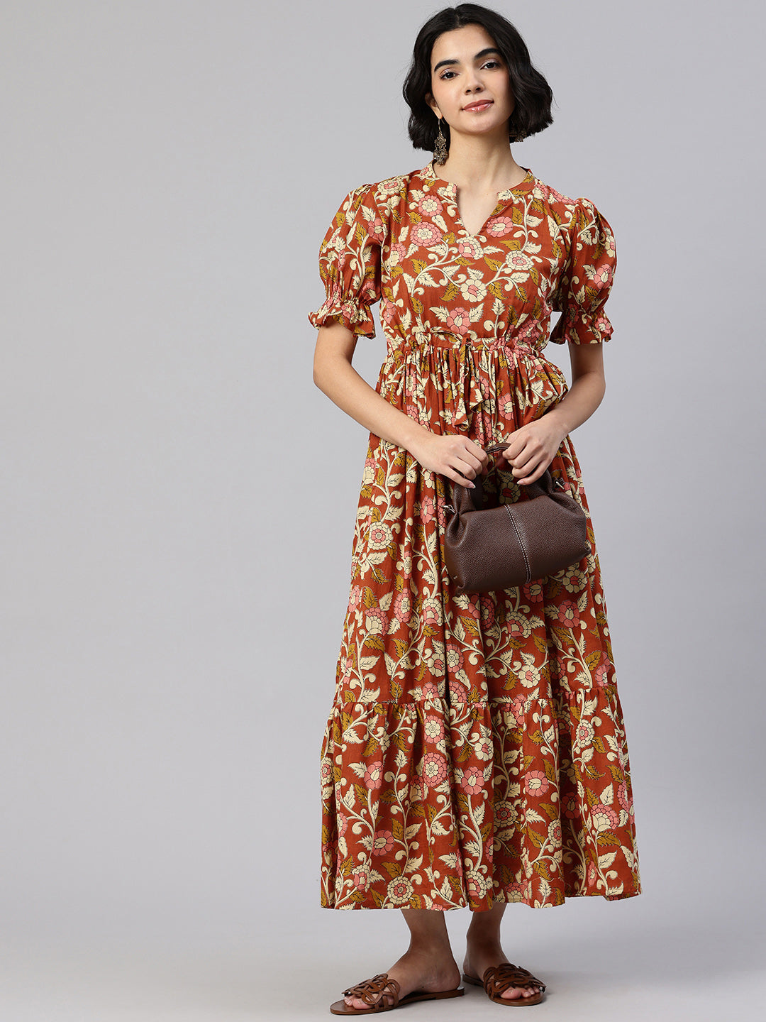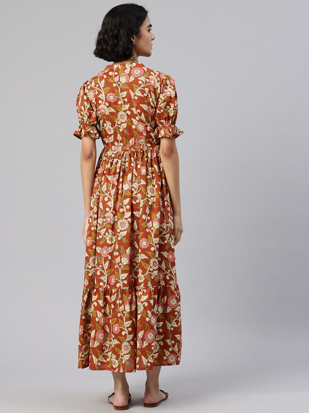 Yellow Mandarin Collar neck midi dress Puff sleeves and flared hem.