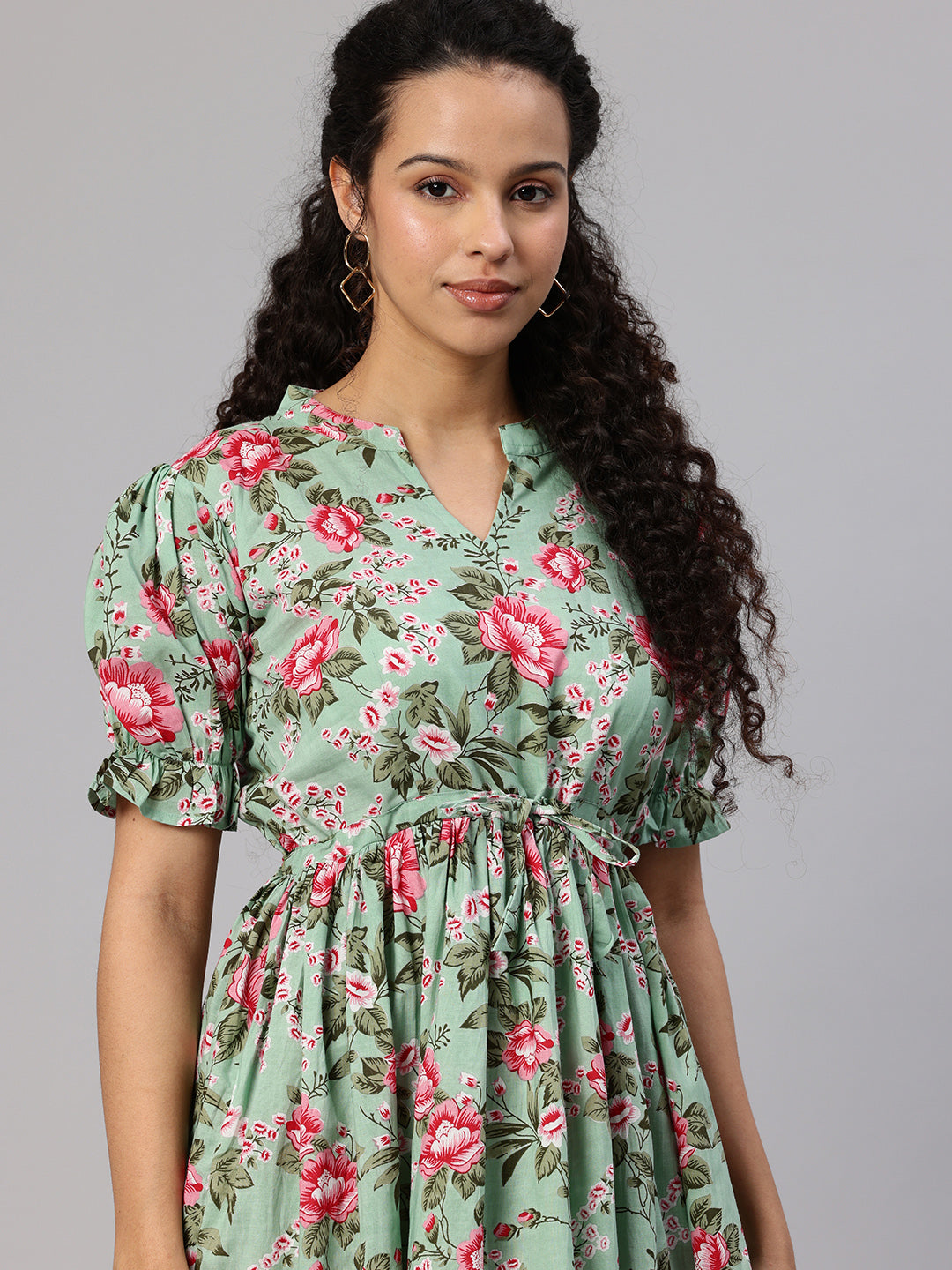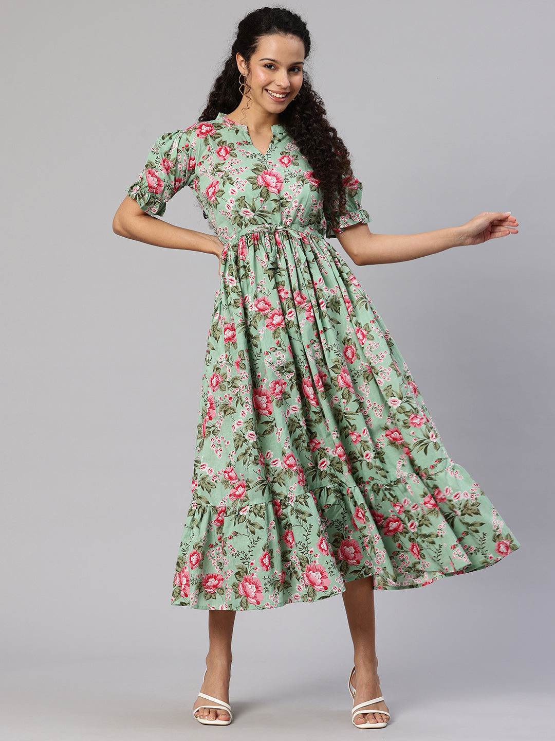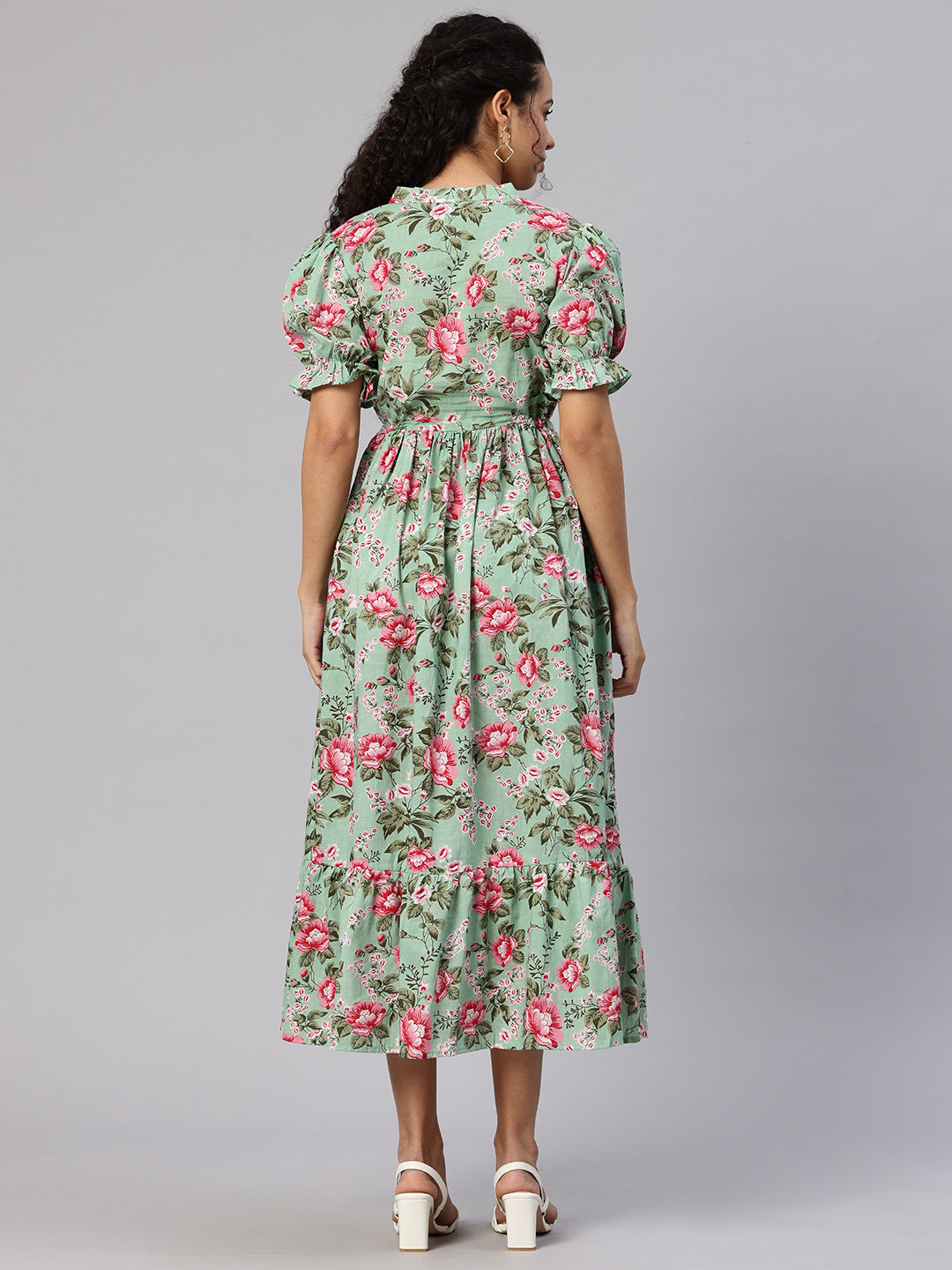 Green Printed fit and flare dress. Has a Mandarin Collar, short, short sleeve, Gathered or pleated detail, Midi length in flared hem.