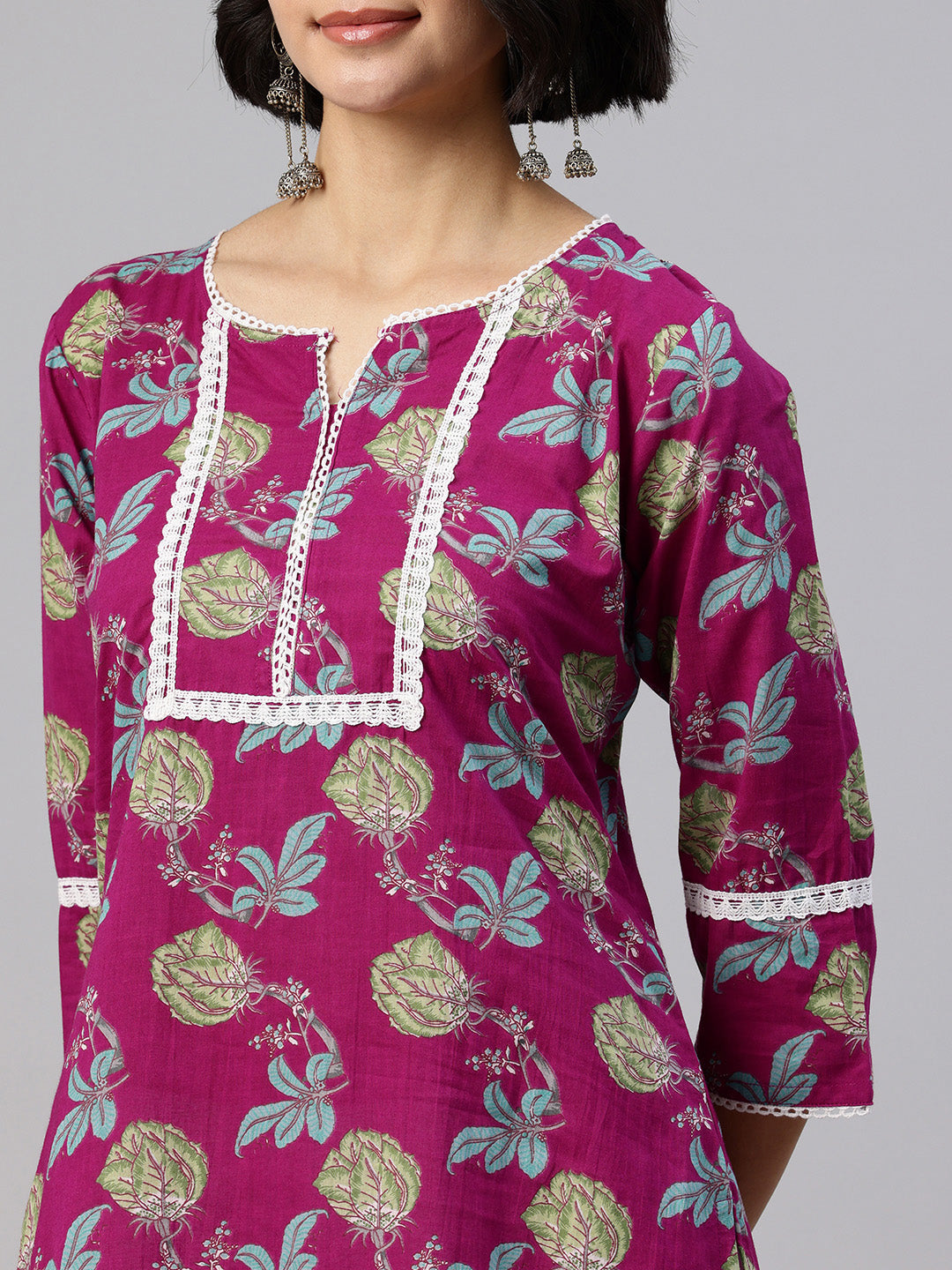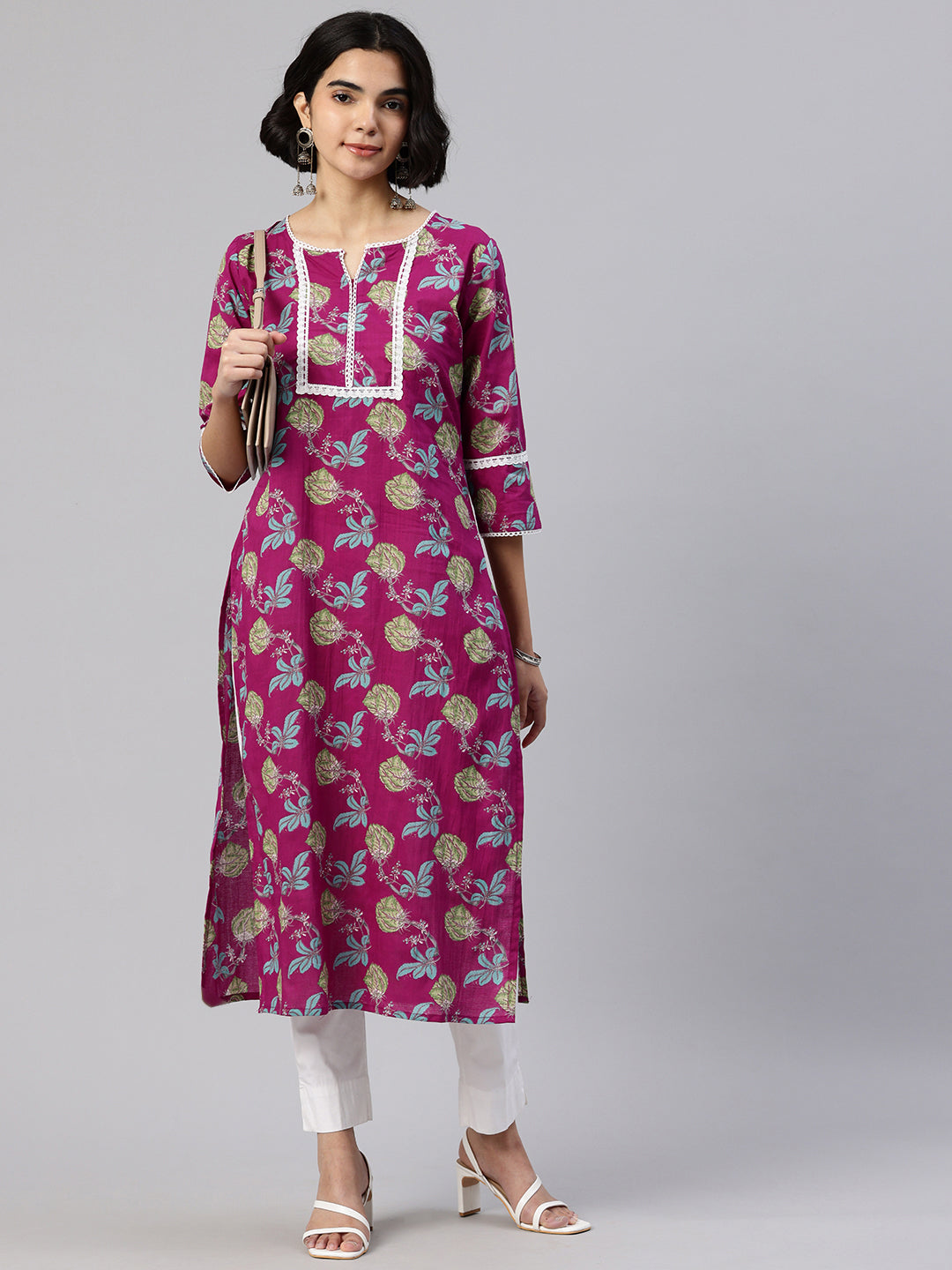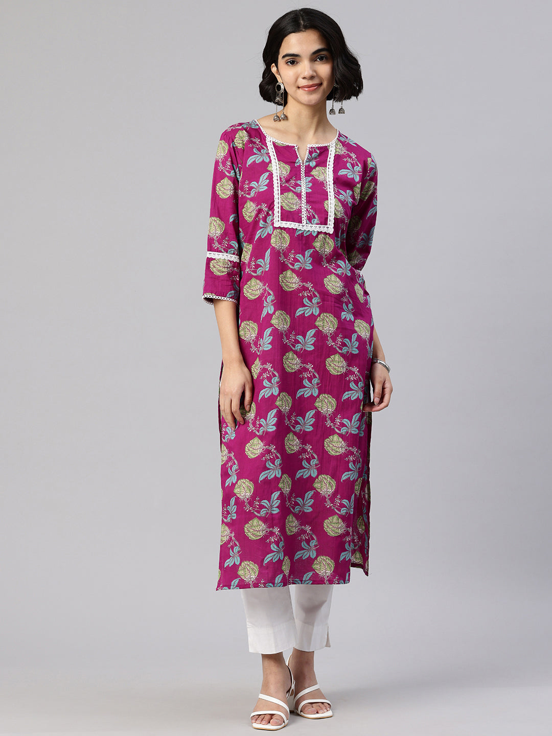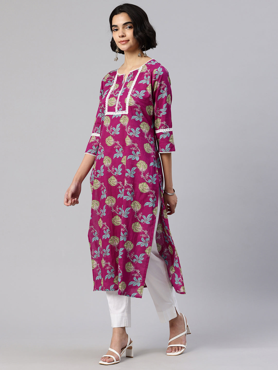 Magenta Straight kurta, has a round collar, three-quarter sleeves, straight hem, and multiple slits, Calf Length.