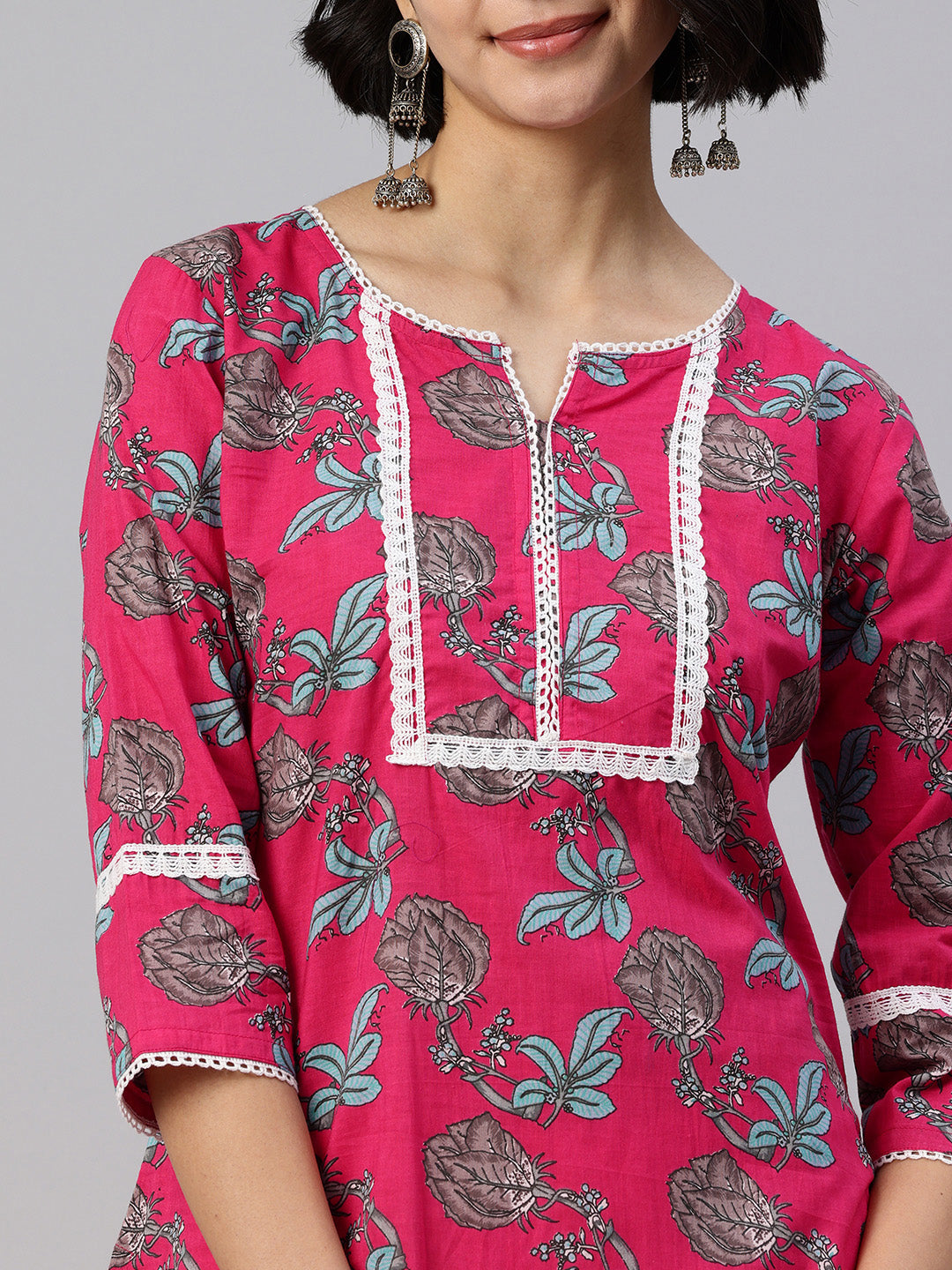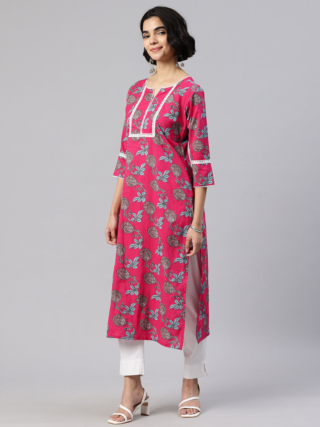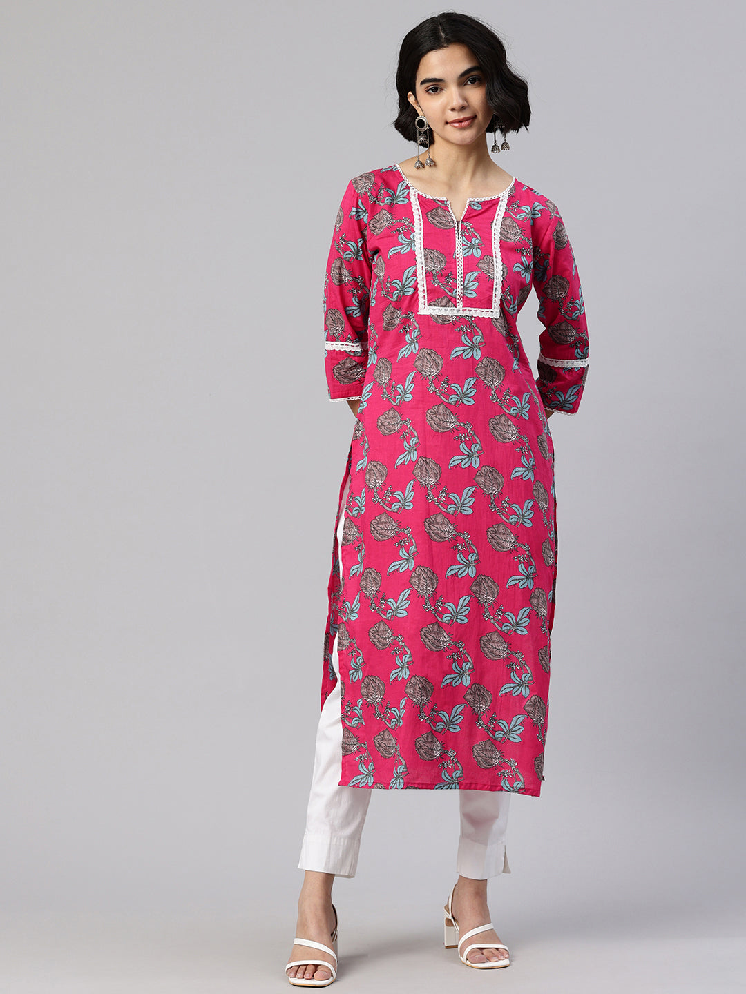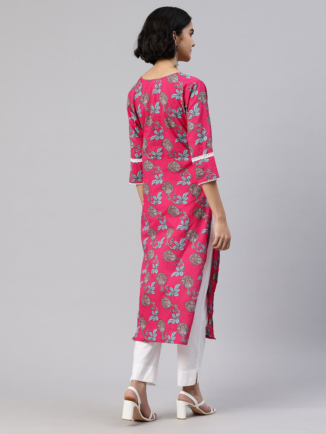 Pink Straight kurta, has a round collar, three-quarter sleeves, straight hem, and multiple slits, Calf Length.
