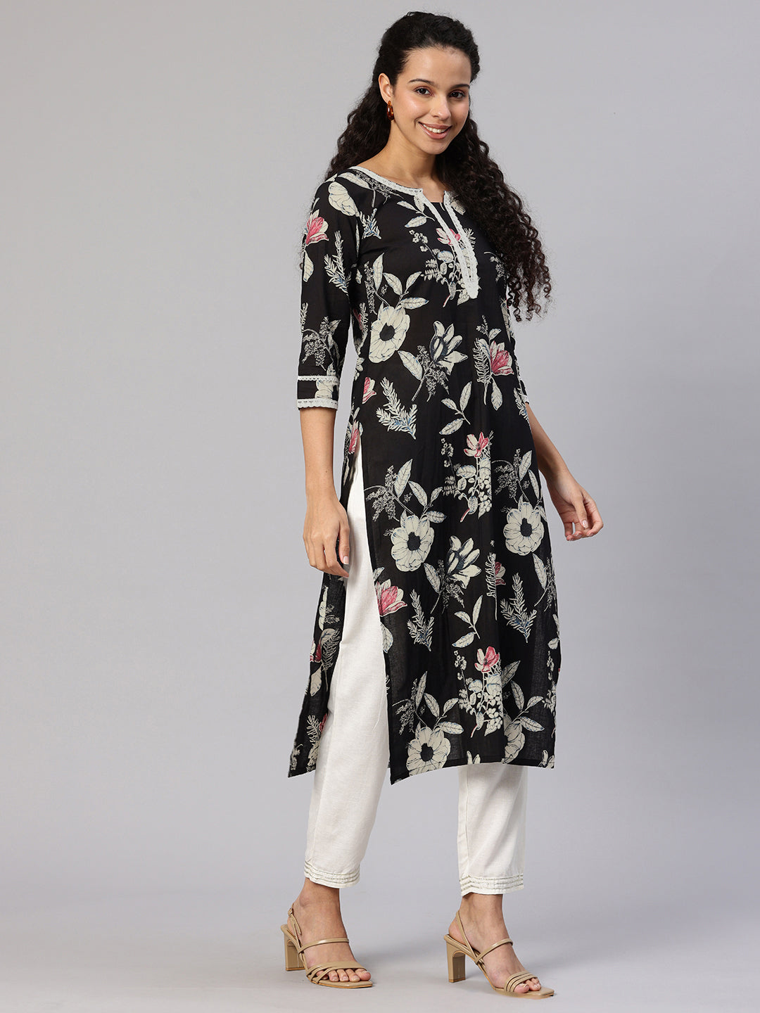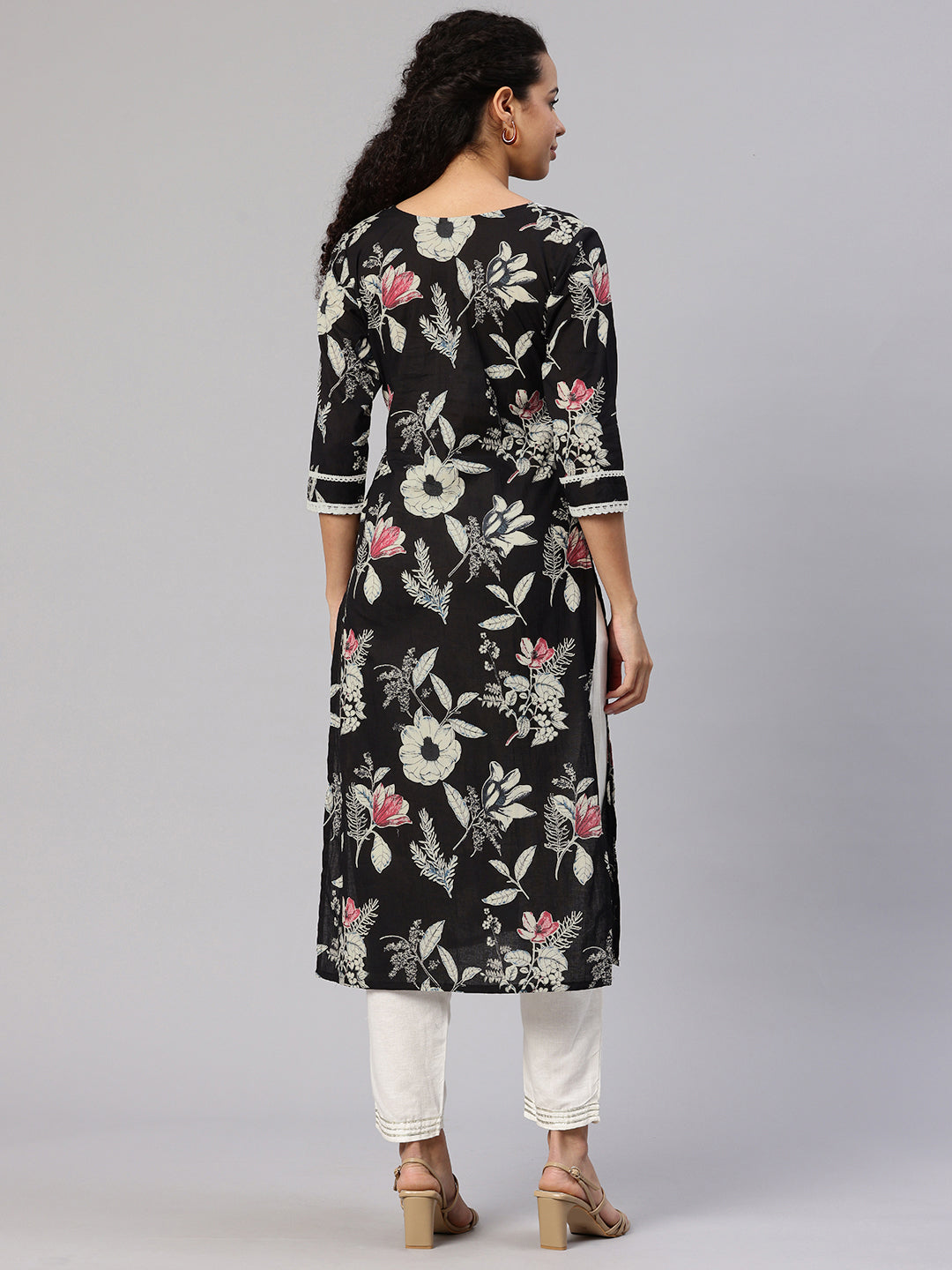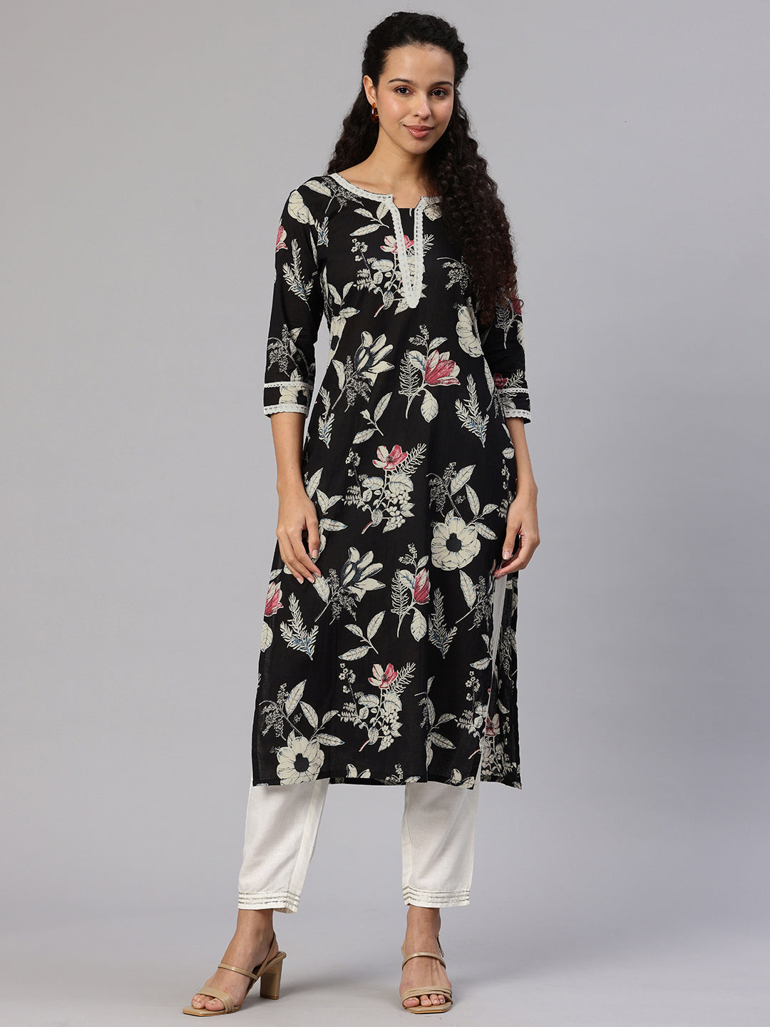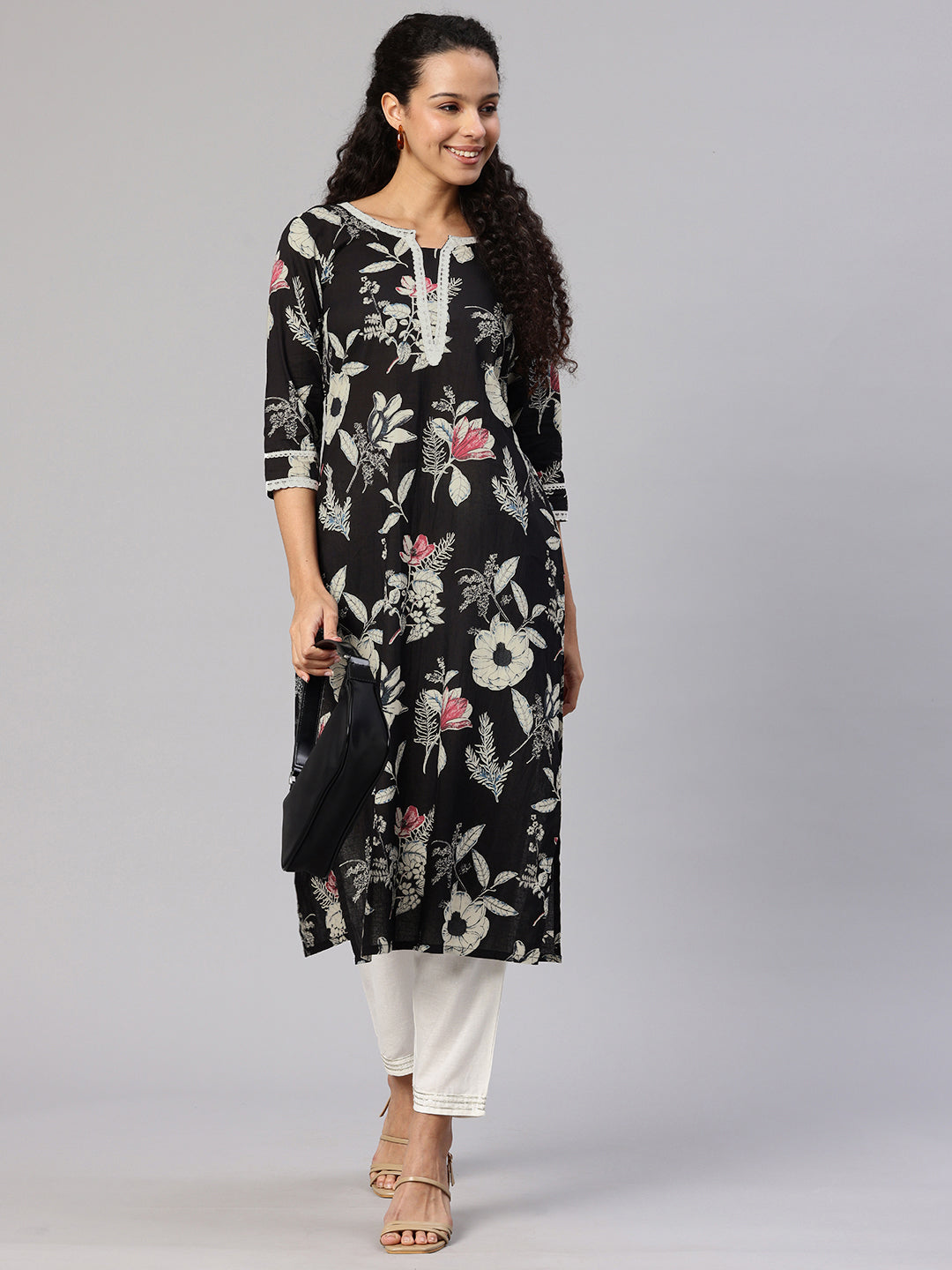 Black A-line Kurta, has three-quarter regular sleeves, Round Neck, and Straight hem. and Calf Length.