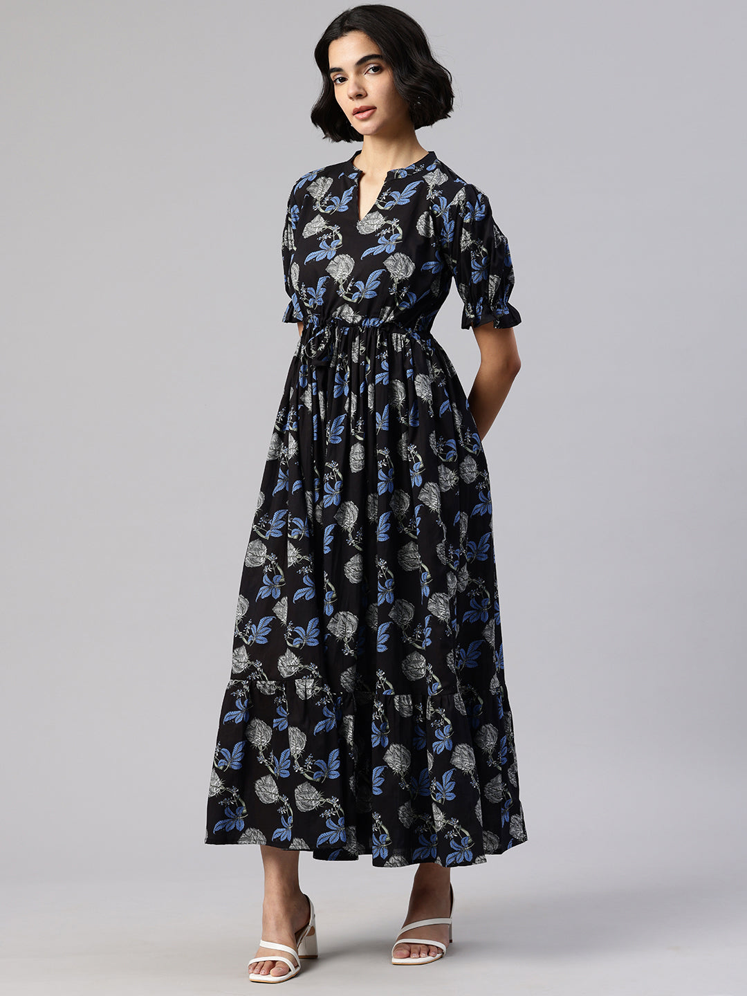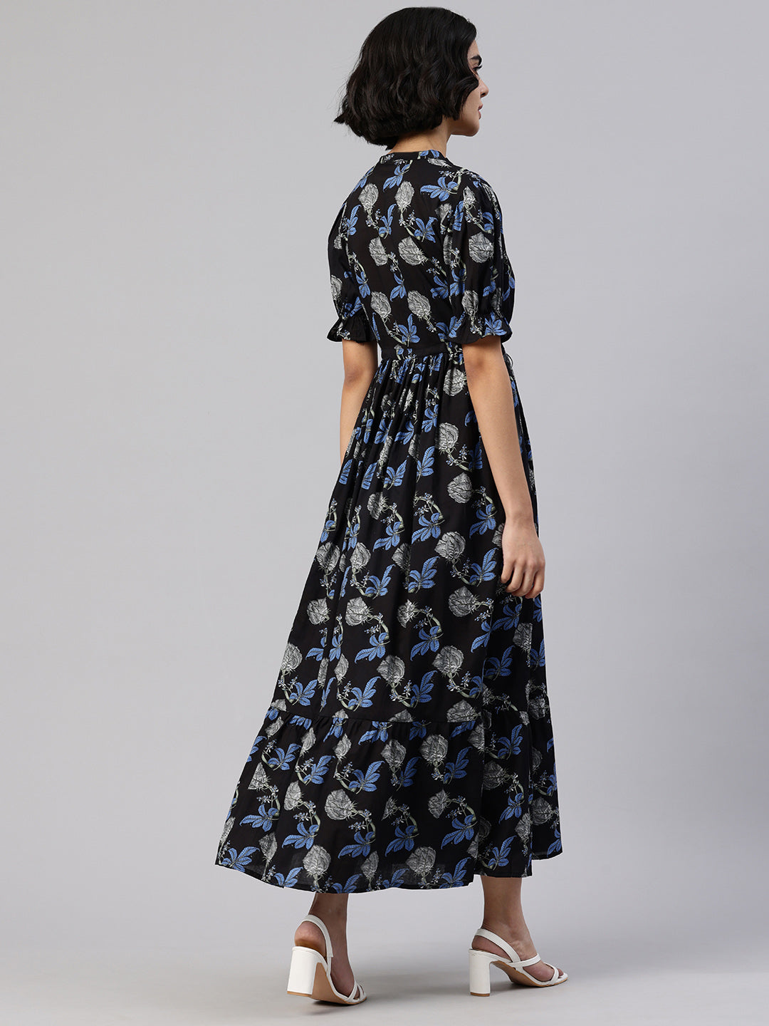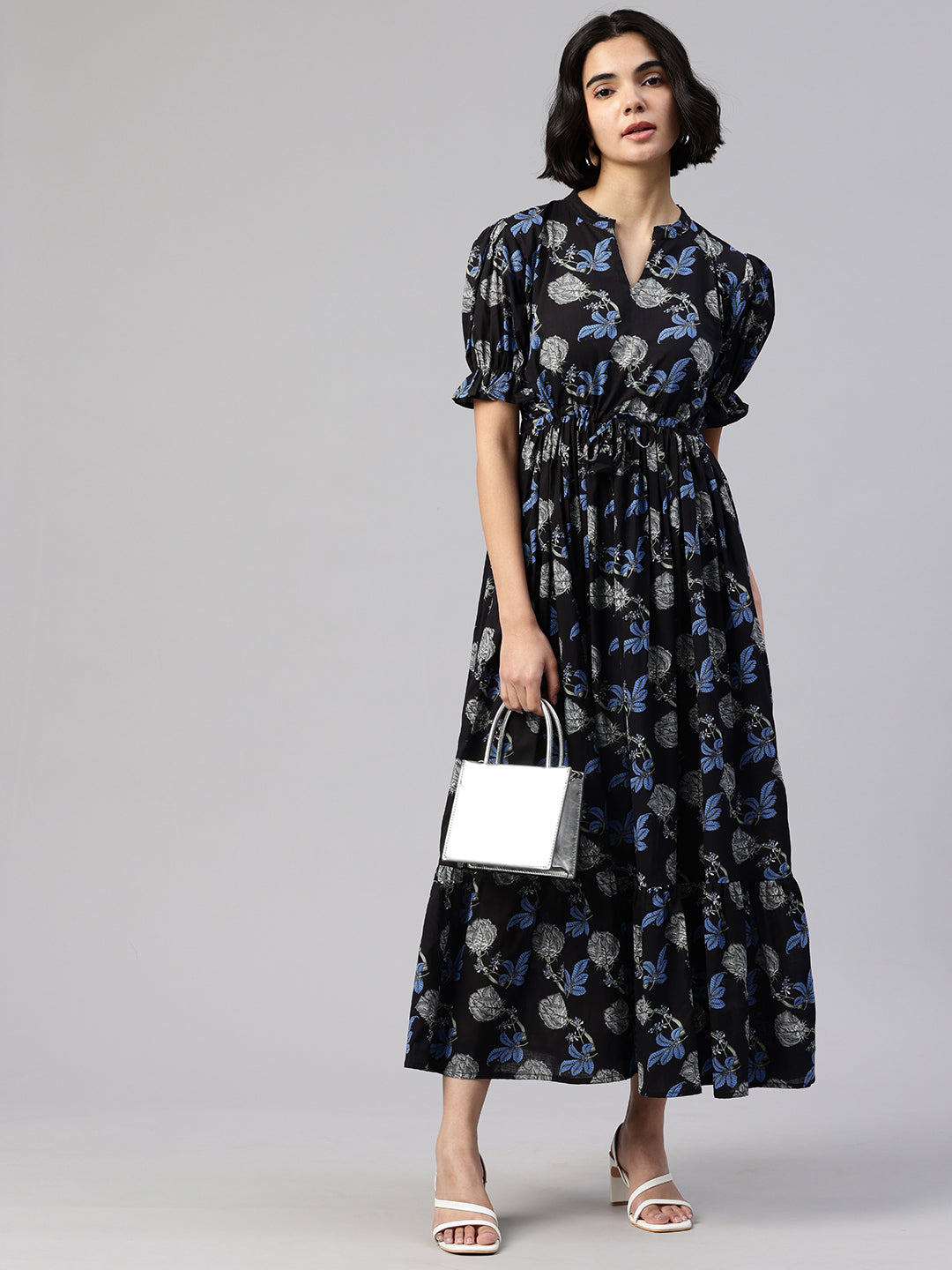 Black Mandarin Collar neck midi dress Puff sleeves and flared hem.